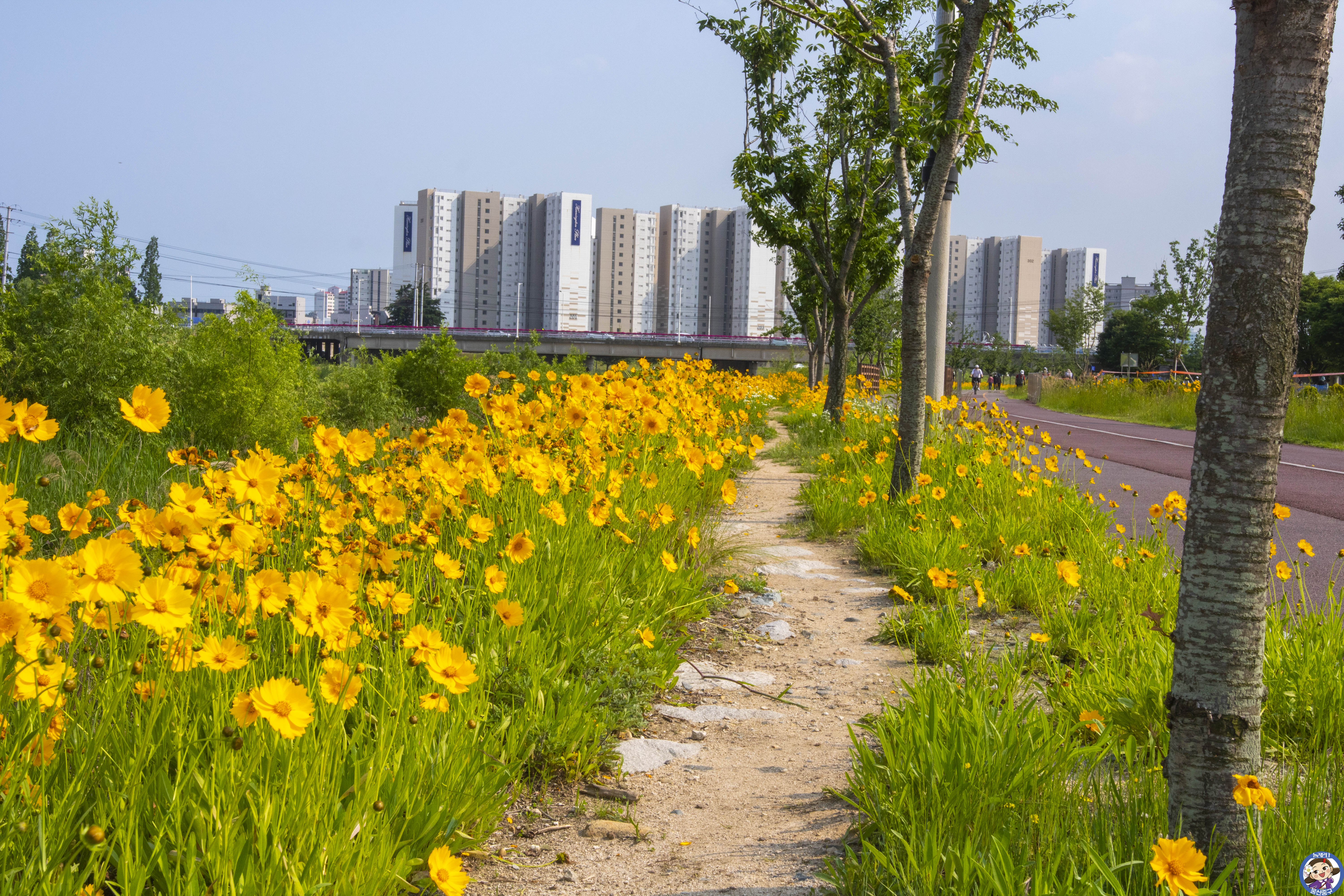 지나다니면서 몇송이씩 피어있는 금계국을 봤을때는 별 생각이 없었는데 동천 산책로 일대에 일자로 샛노란 꽃물결이 장관을 연출합니다.