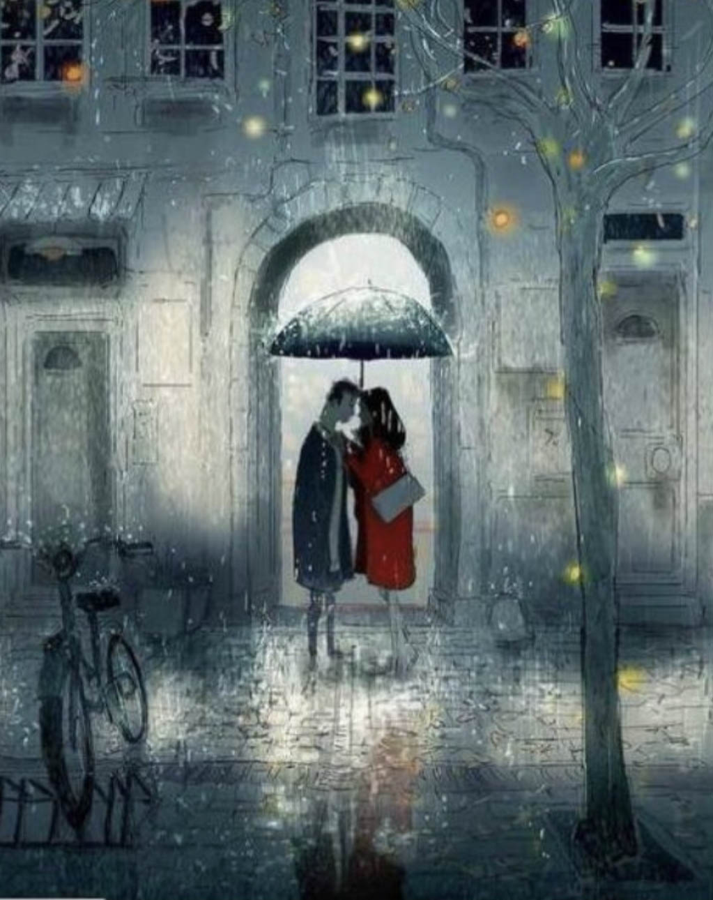 우산 한개에 같이 들어와 비를 피하는 모습...