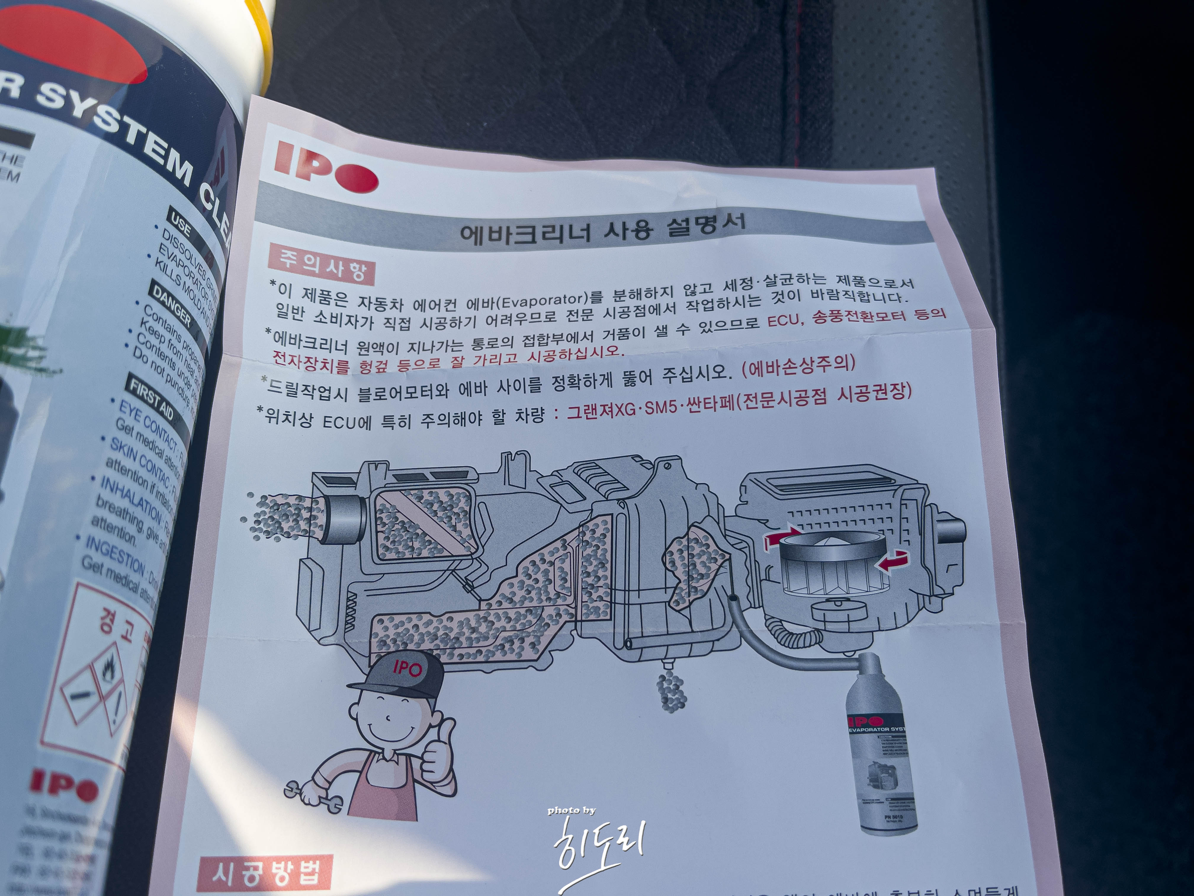 에어컨 최저온도로 최대 송풍속도 외기유입모드를 설정을 하신뒤 바람의 방향은 전방으로 설정해주세요. 그리고 에바크리너의 액을 분사해줍니다.
