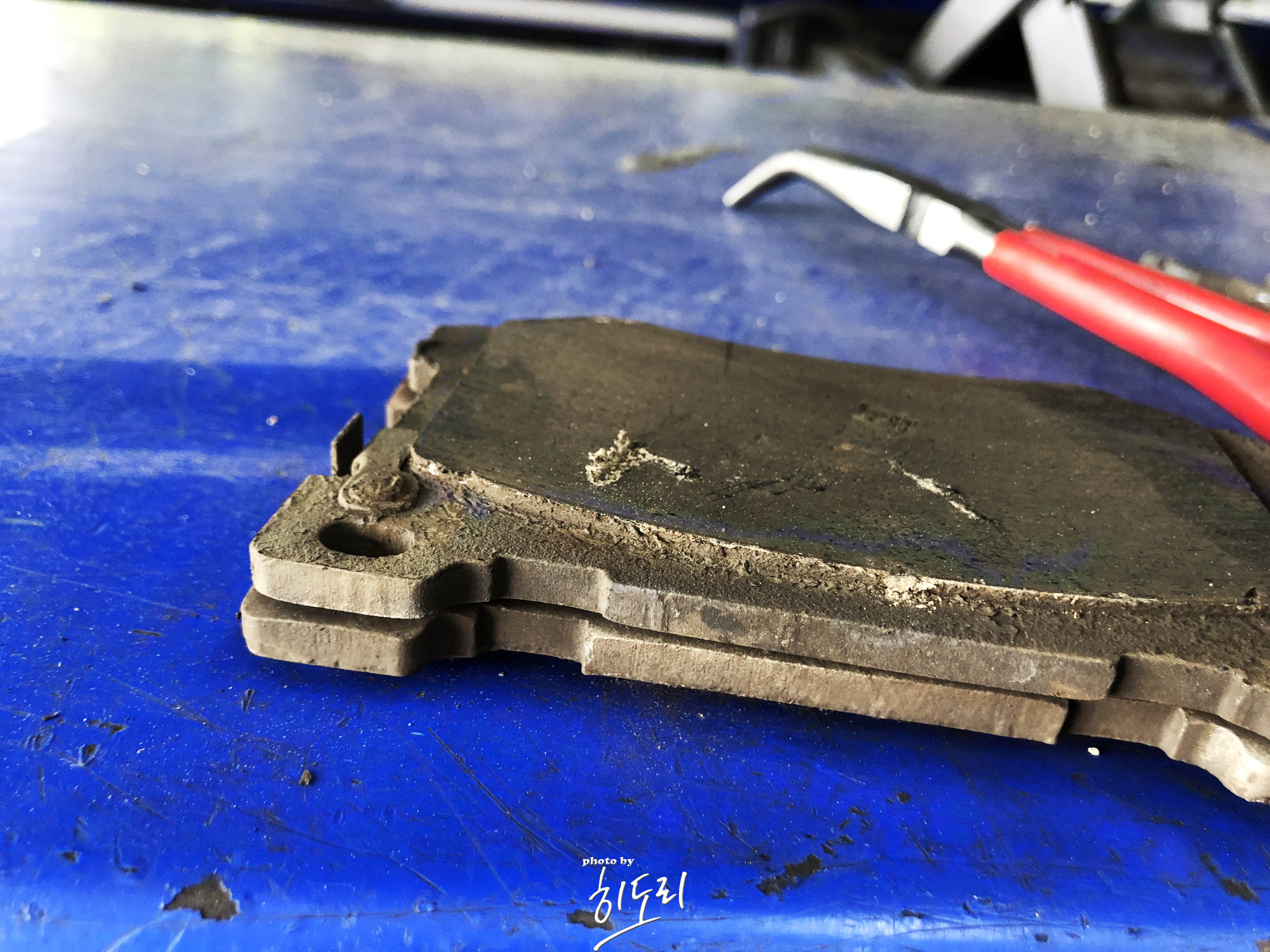 그리고 캘리퍼에 붙어 있는 브레이크 패드도 살펴보니.., 패드상태도 끝... ㅋㅋ