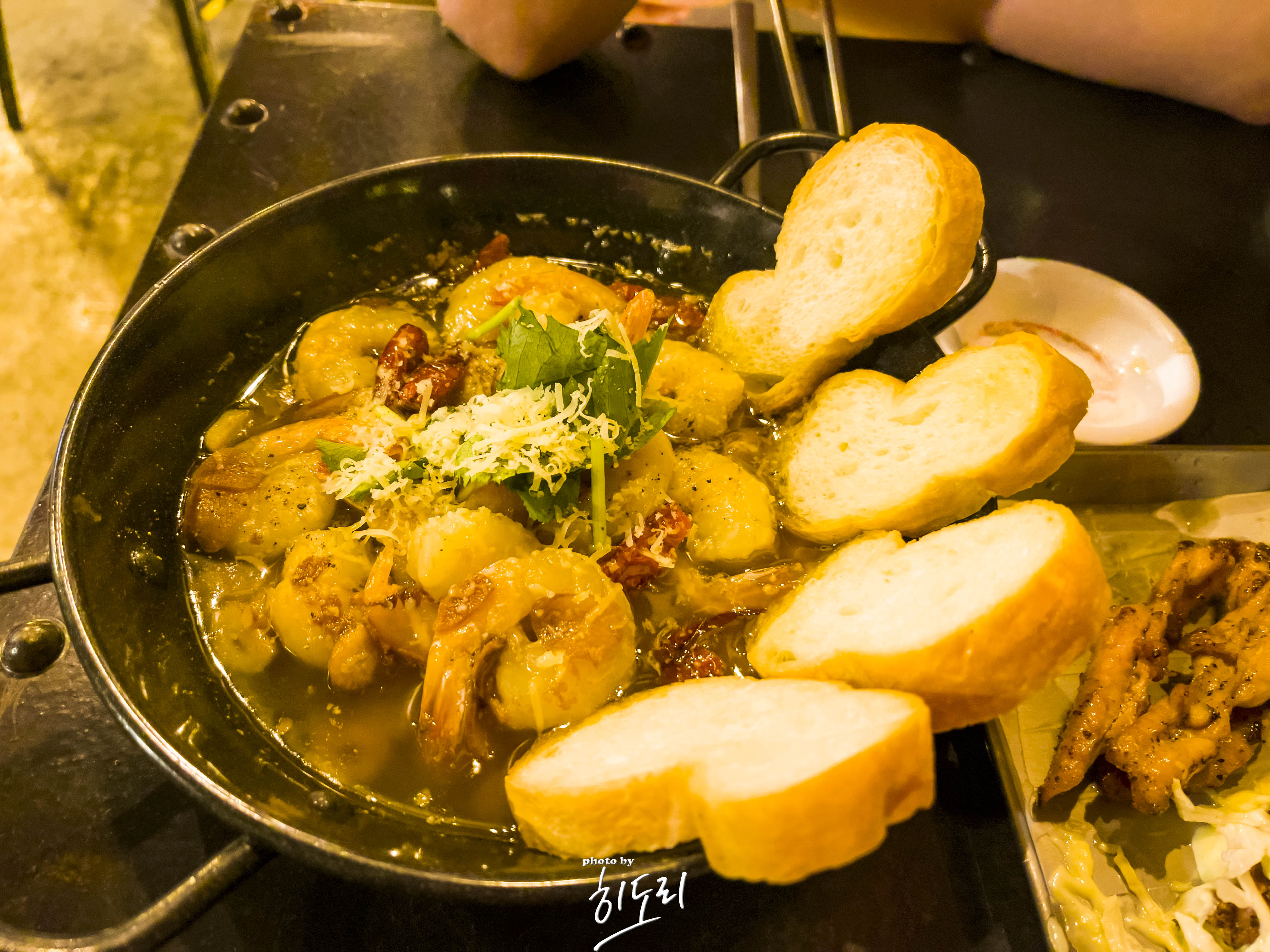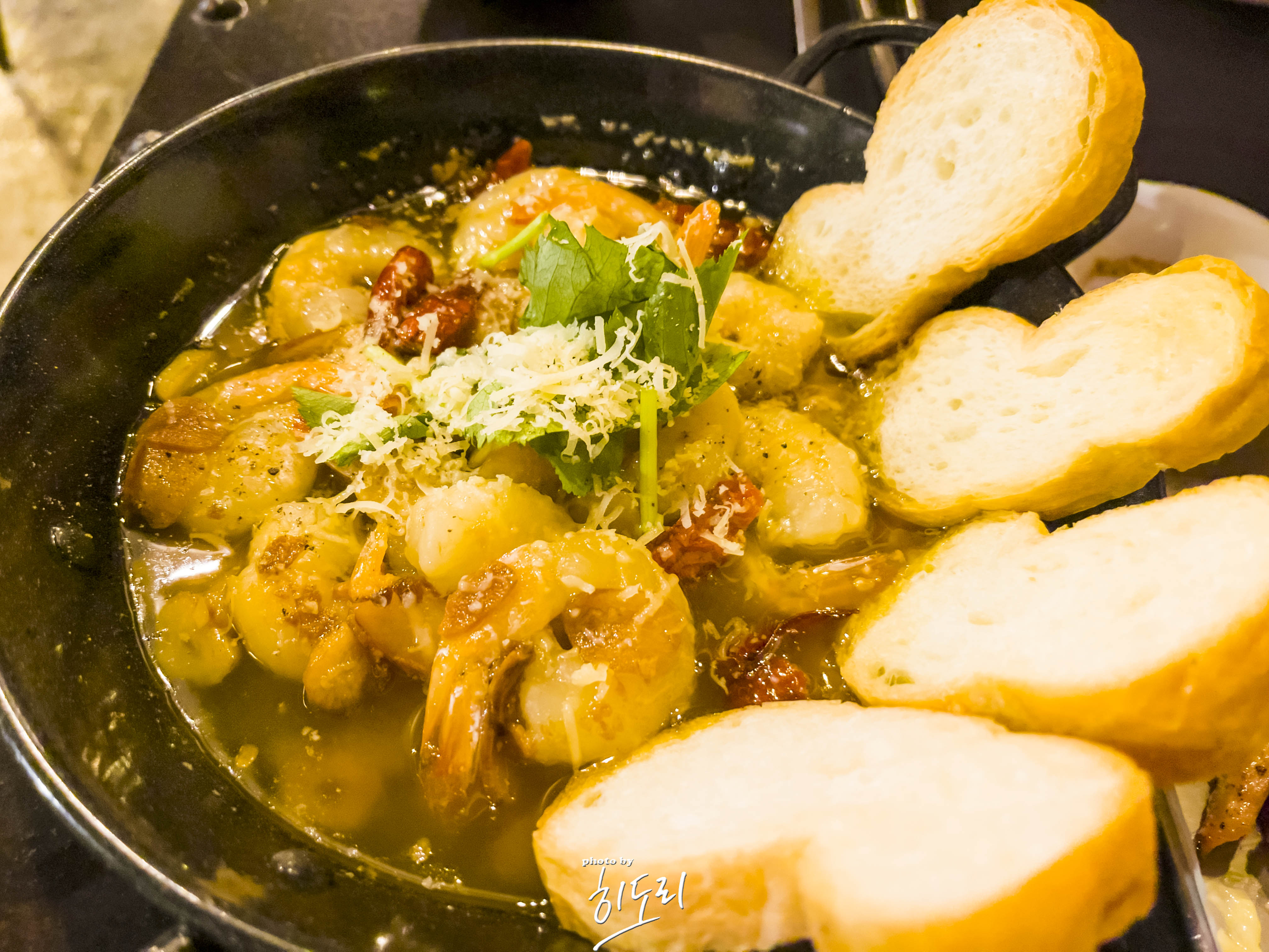 오일을 듬뿍 먹은 새우에 빵을 찍어 먹는데~