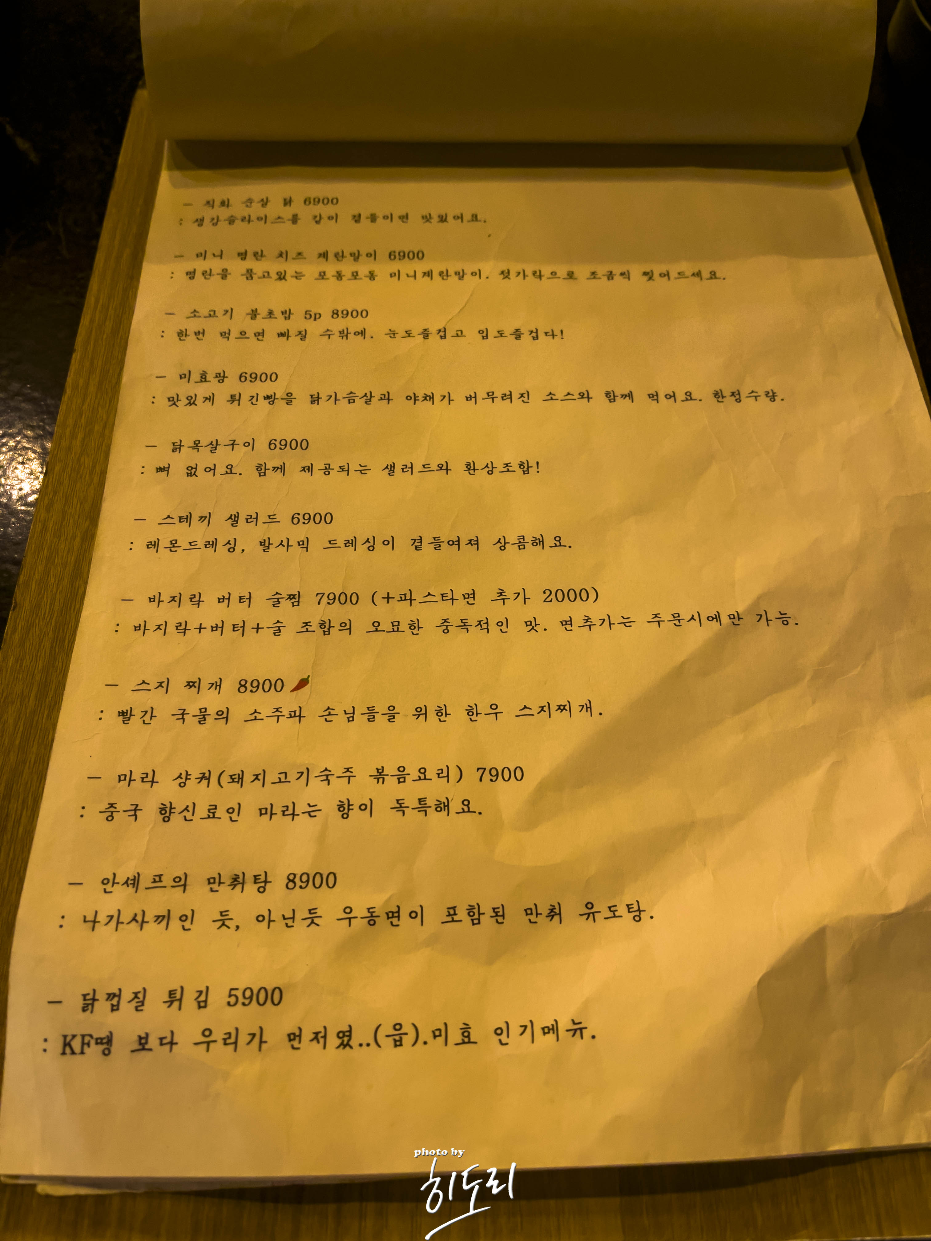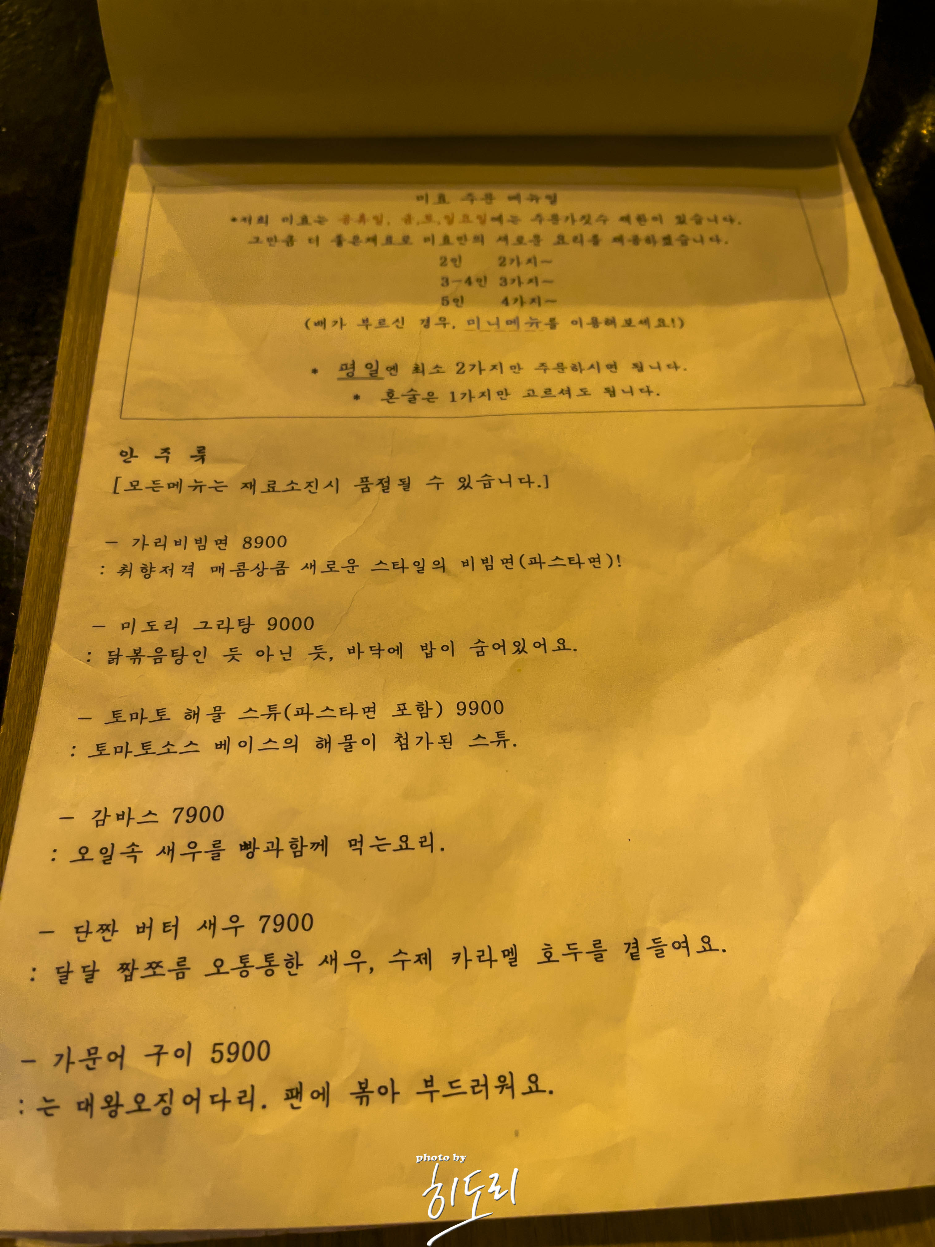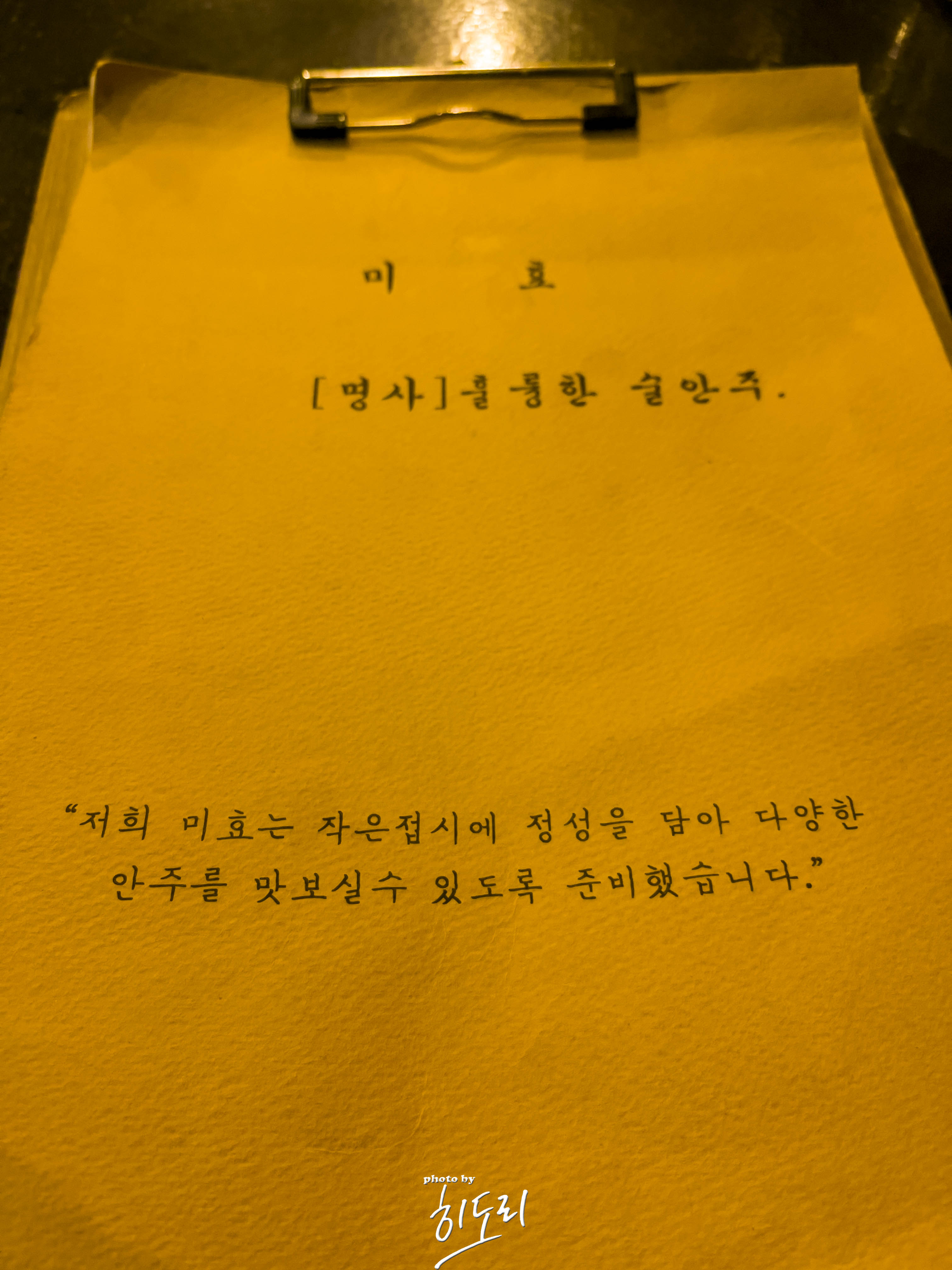 미효 [명사] 훌륭한 술안주 ' 저희 미효는 작은접시에 정성을 담아 다양한 안주를 맛보실수 있도록 준비했습니다' 라는 문구에 적혀져 있듯 진짜 음식들이 전부 맛있습니다.