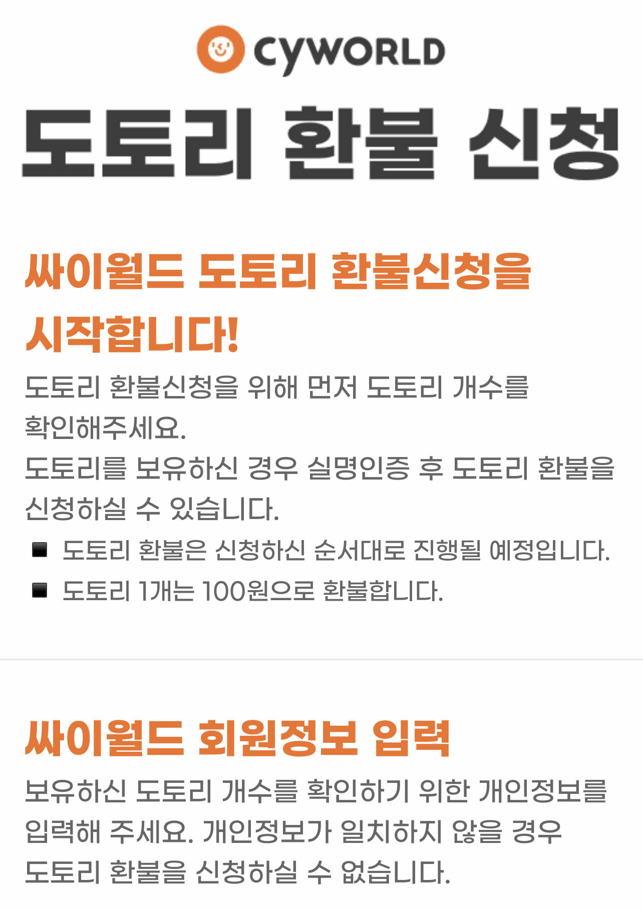 바로 싸이월드의 도토리를 환불받기 위함이죠.