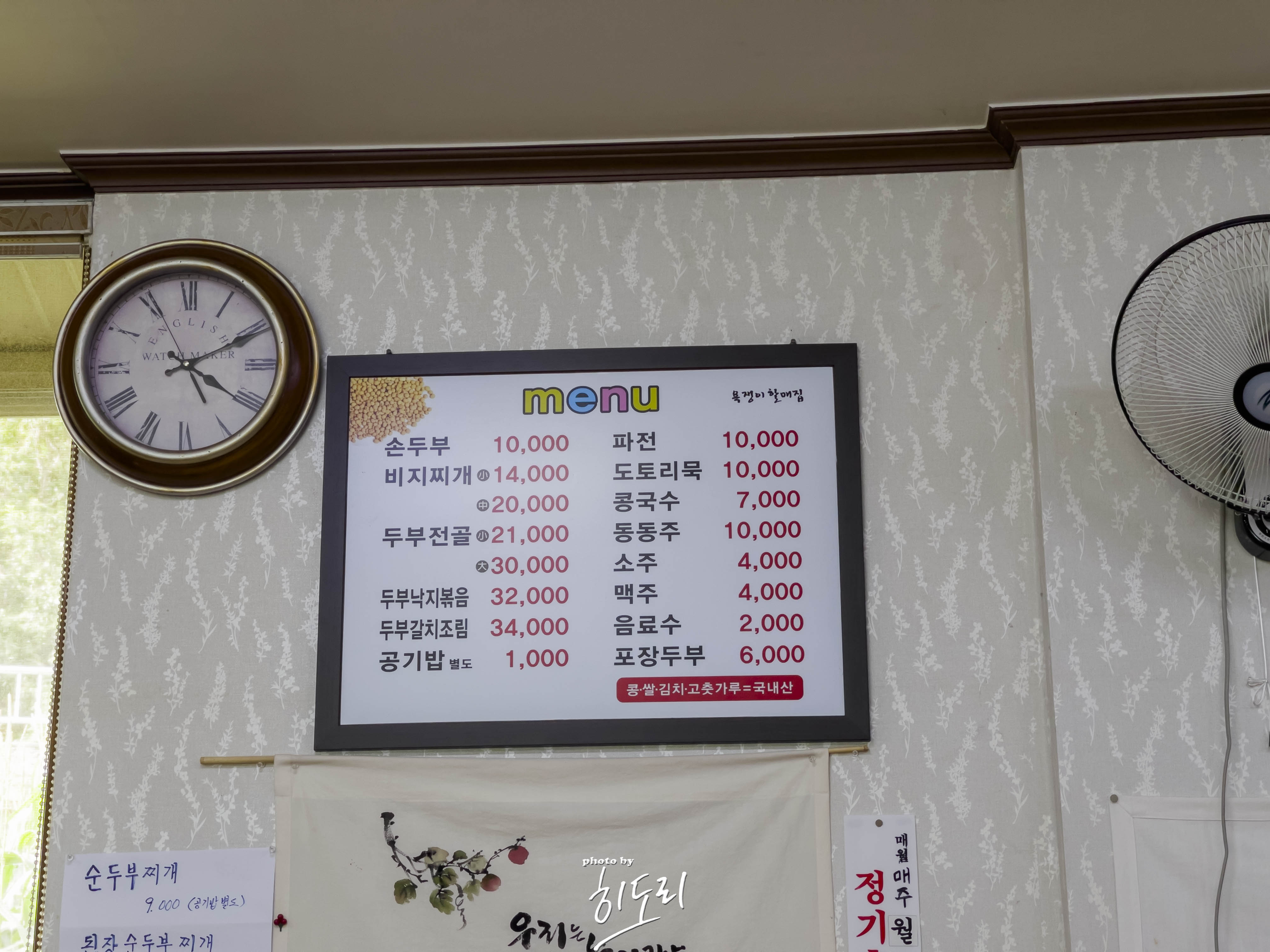 손두부.비지찌게,두부전골등 각종 두부요리들이 있고 그밖에 파전과 도토리묵도 있는데 맛있다고 소문이 났더군요.