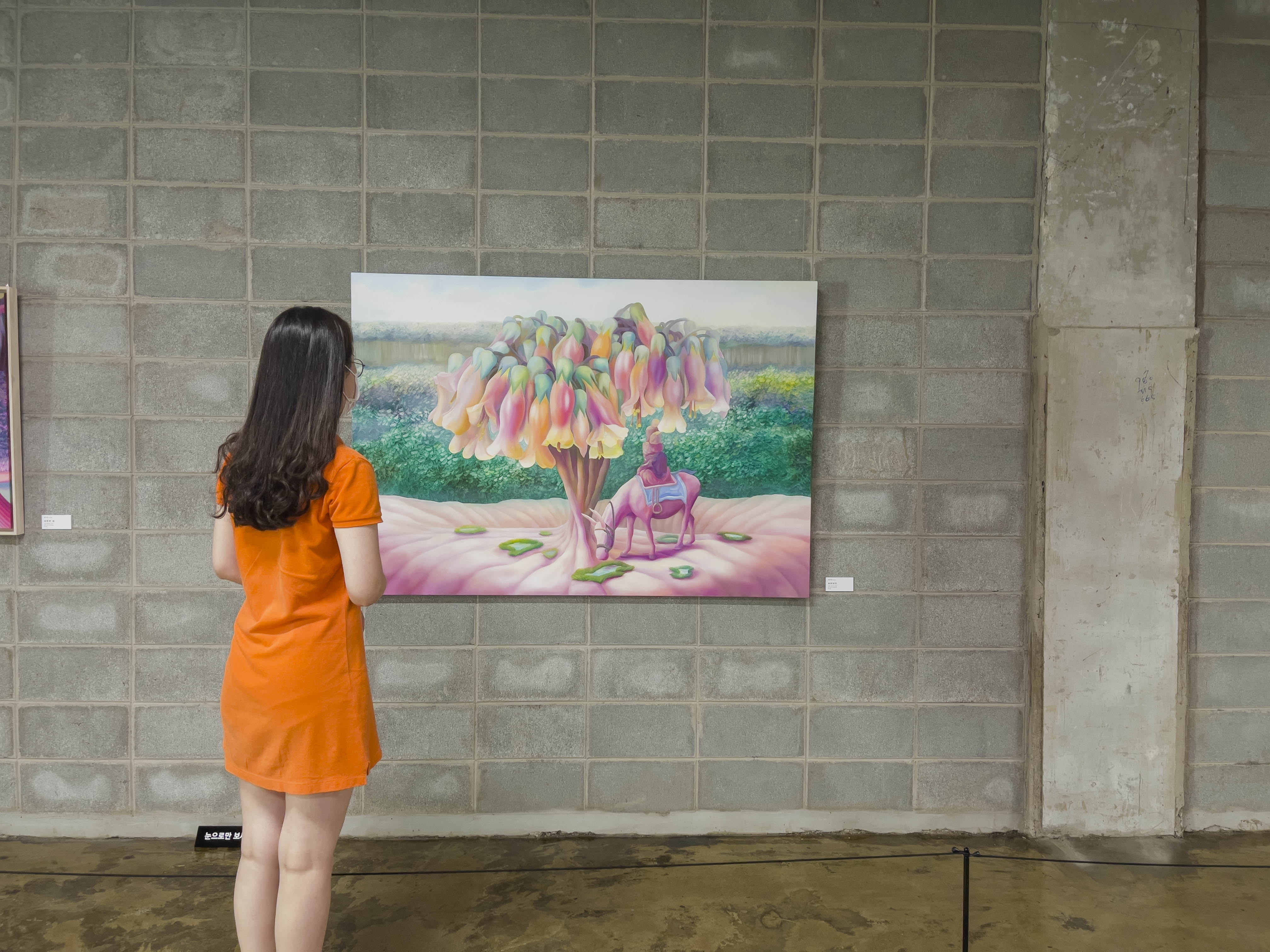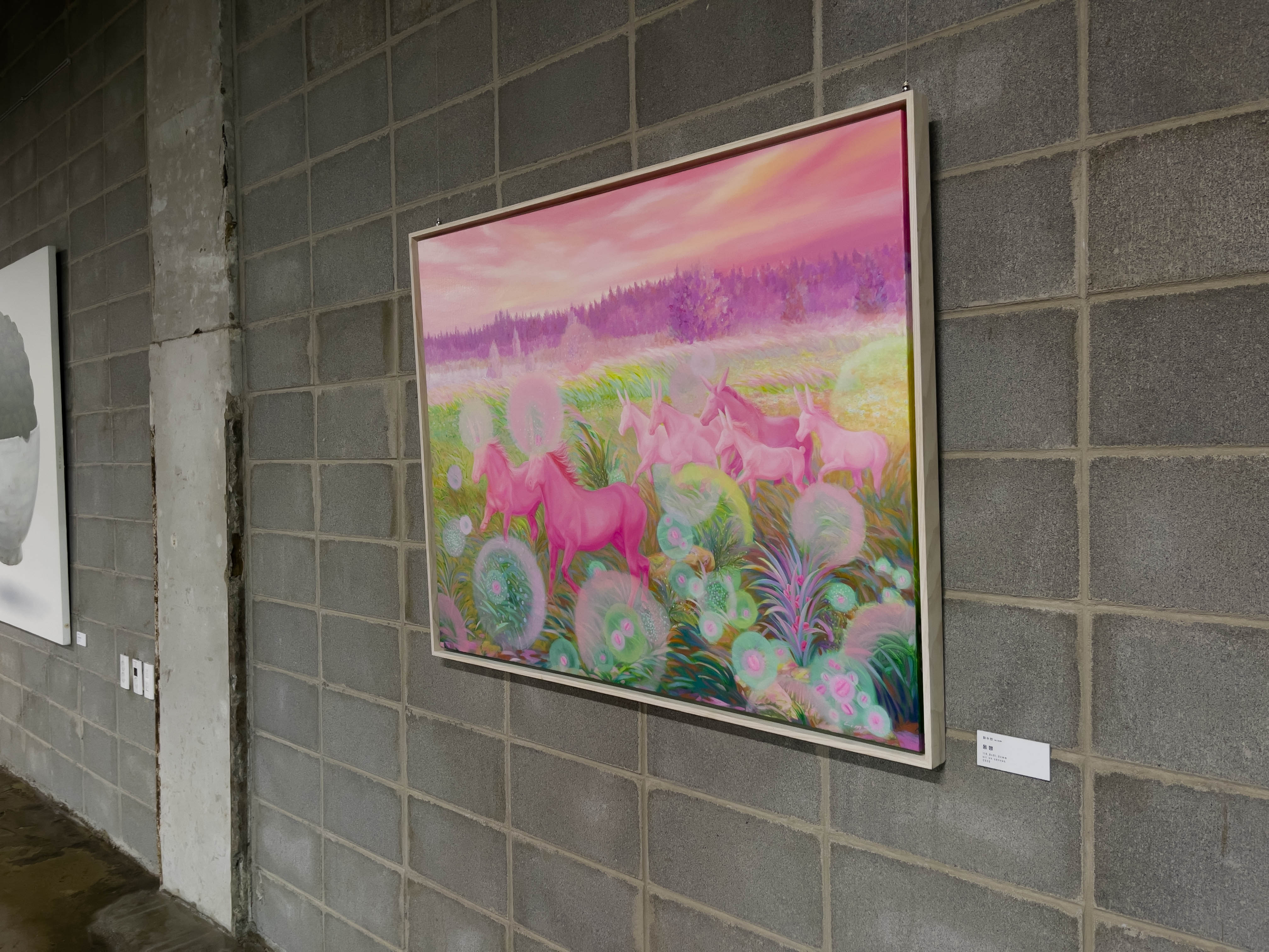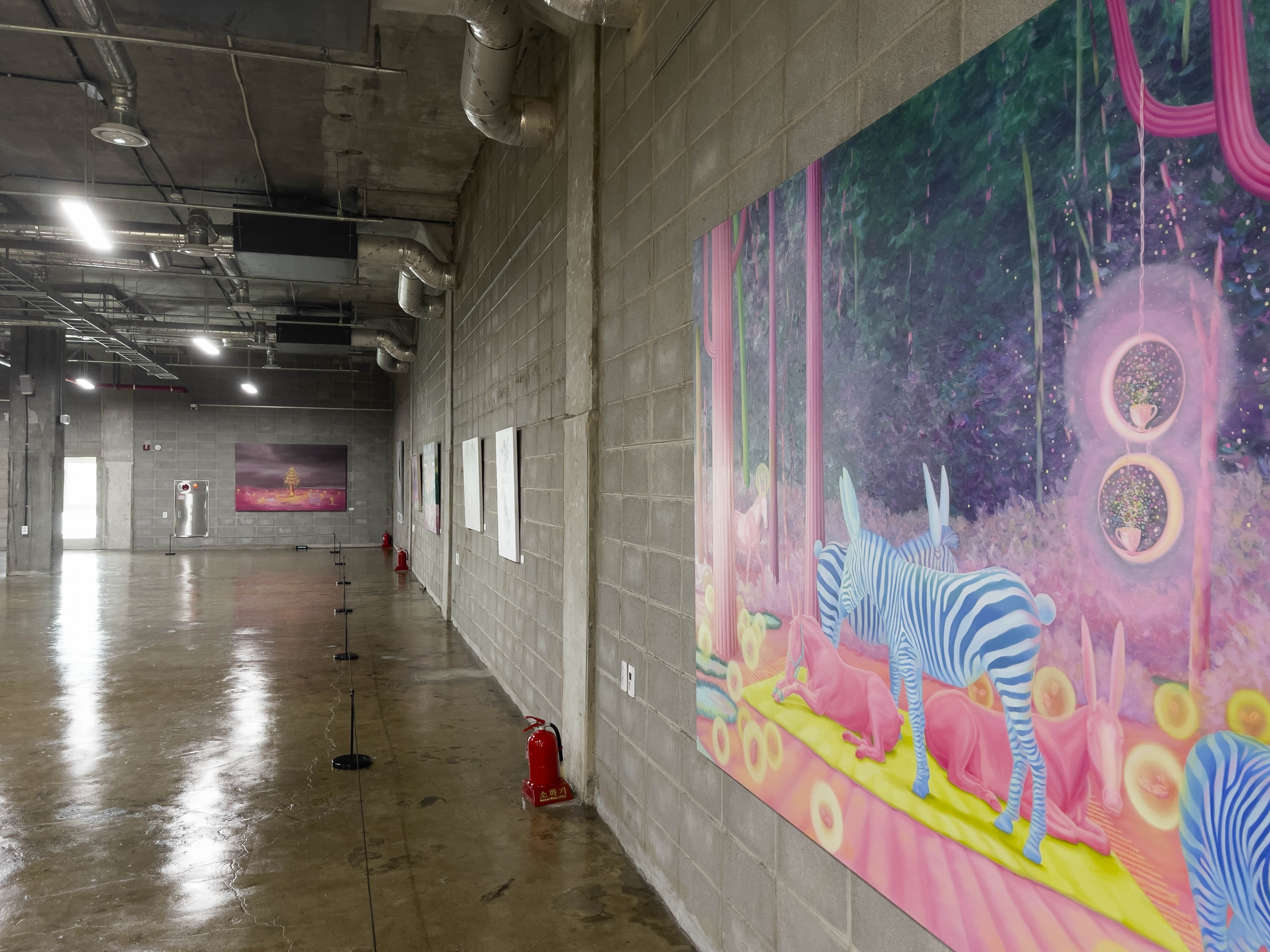 두 작가님의 콜라보로 전시가 되어있는데 울산 출신의 임수빈 작가는 캔버스 화면에 만들어내는 '핑크 월드'의 유토피아를 찾아나서는 나의 모습을 분홍말에 투영해 현실에서는 경험할 수 없는 독특한 환경과 묘한 분위기를 보여줍니다.