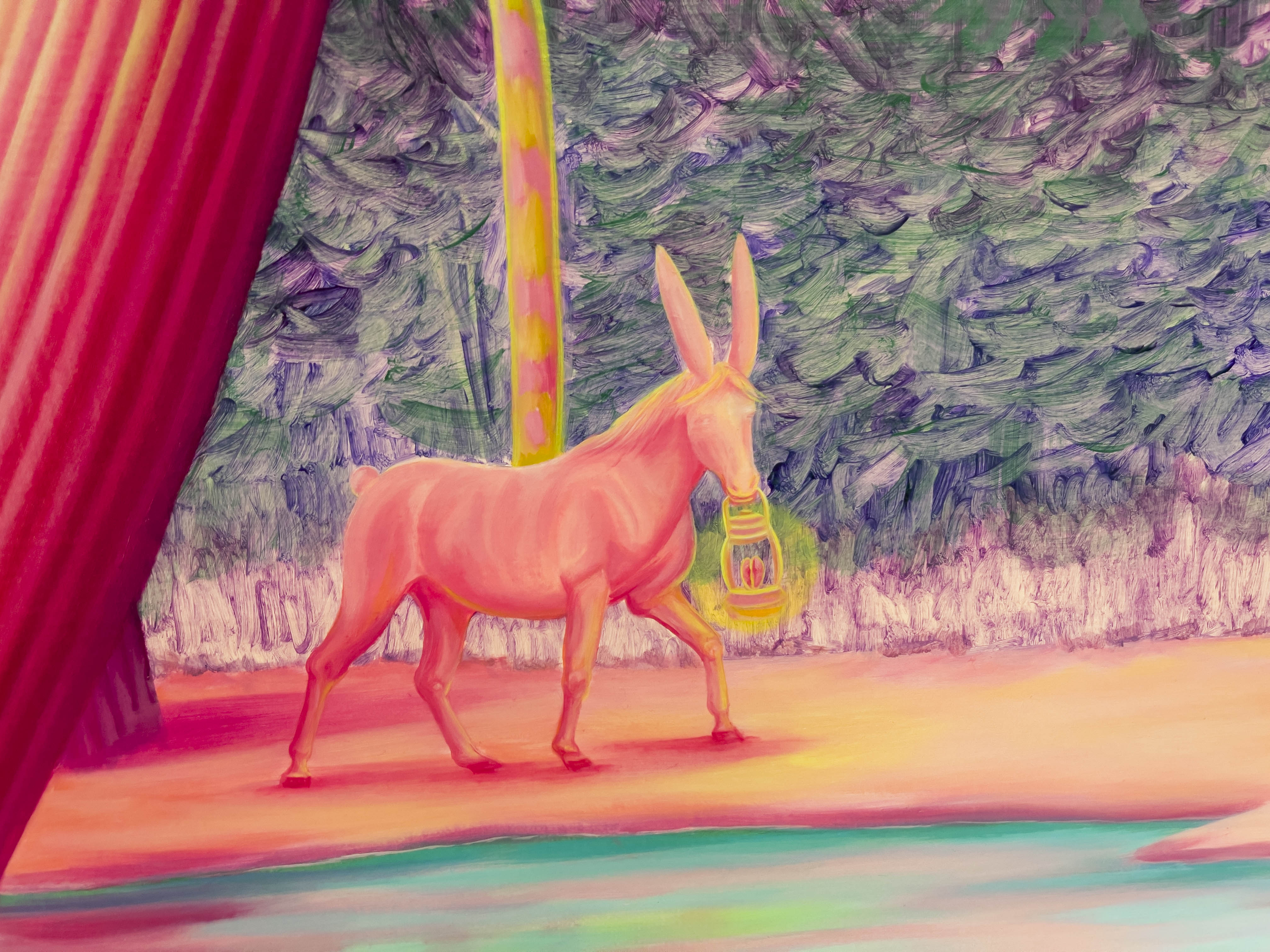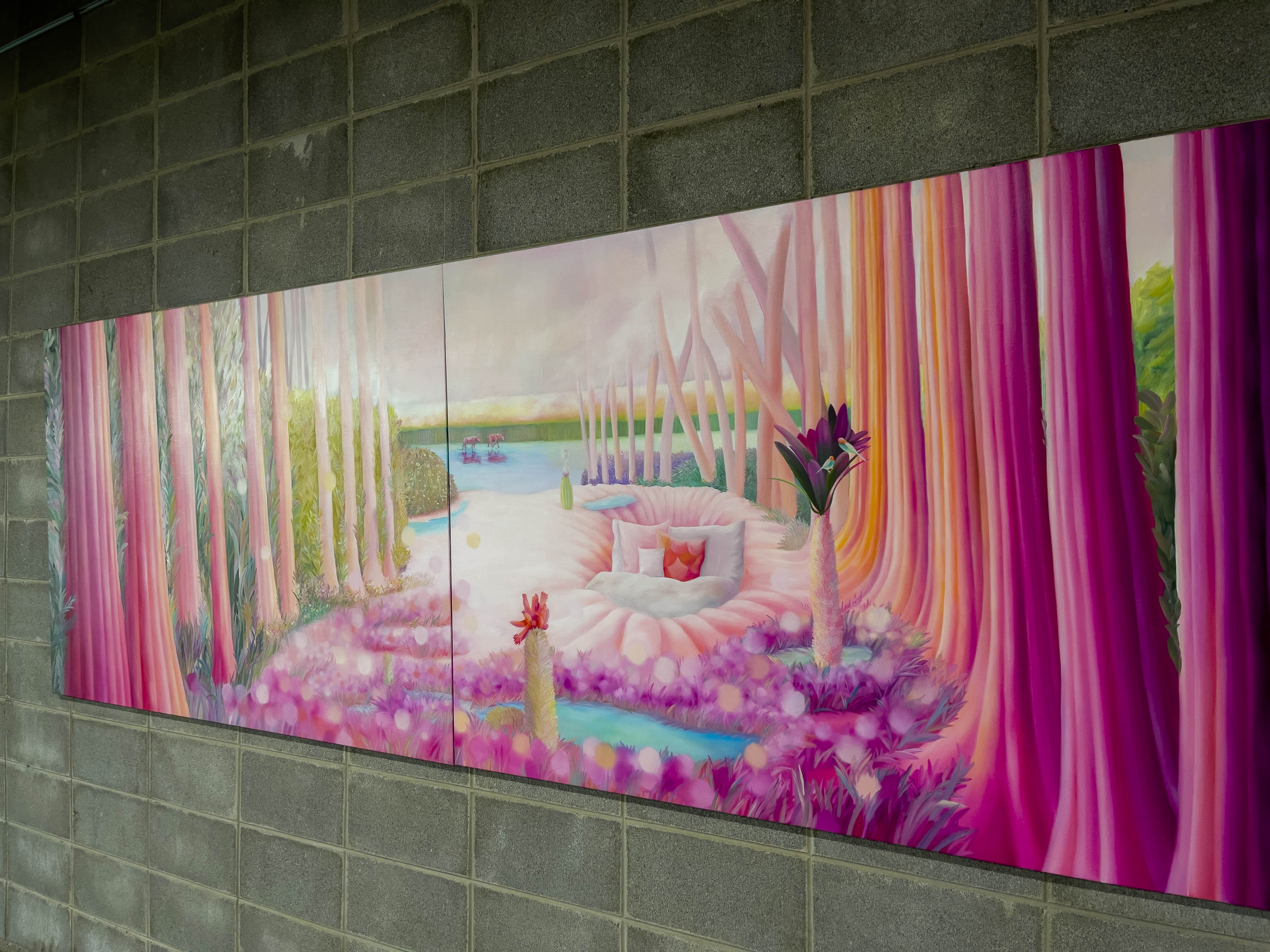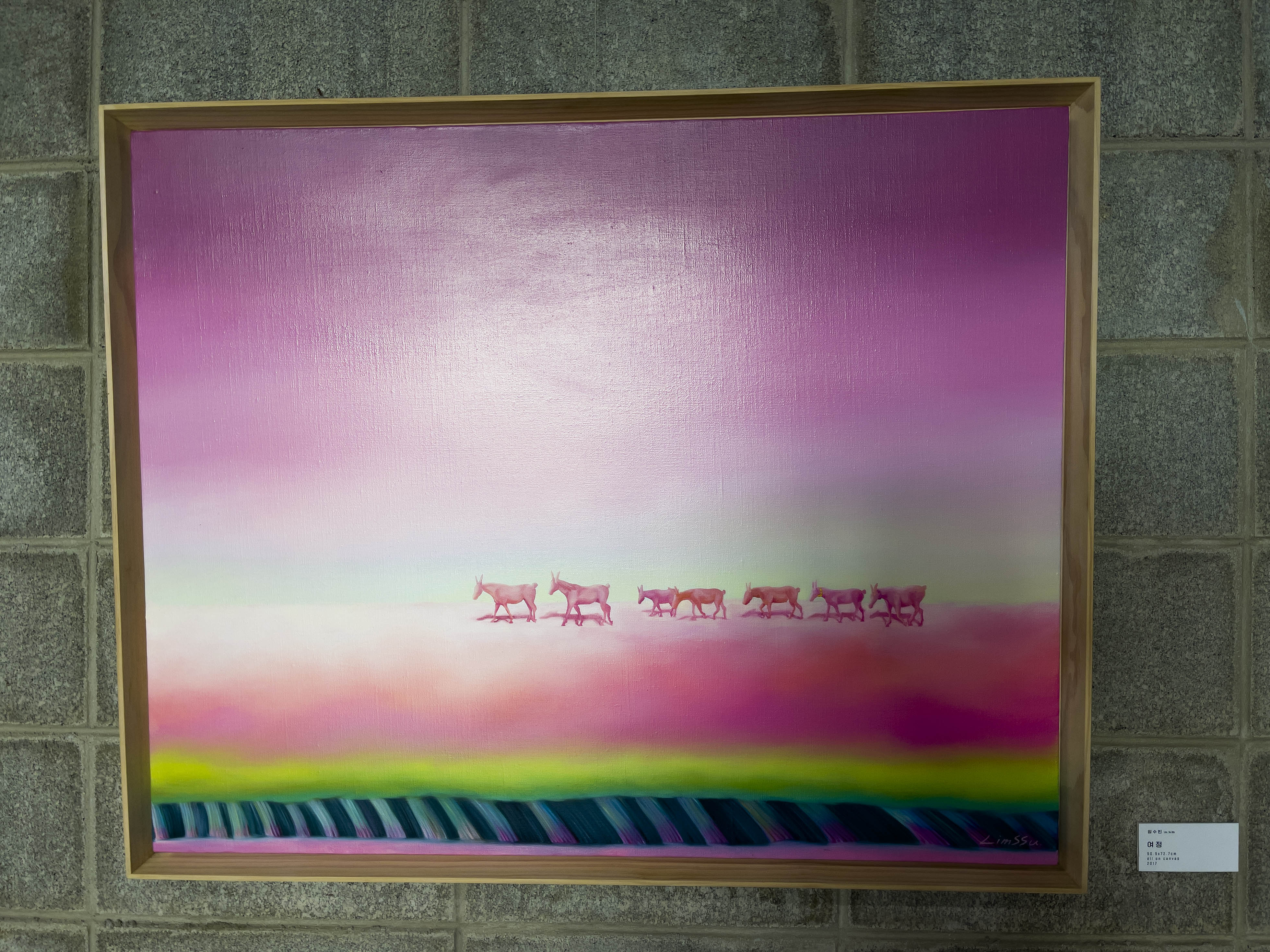 두 작가님의 콜라보로 전시가 되어있는데 울산 출신의 임수빈 작가는 캔버스 화면에 만들어내는 '핑크 월드'의 유토피아를 찾아나서는 나의 모습을 분홍말에 투영해 현실에서는 경험할 수 없는 독특한 환경과 묘한 분위기를 보여줍니다.
