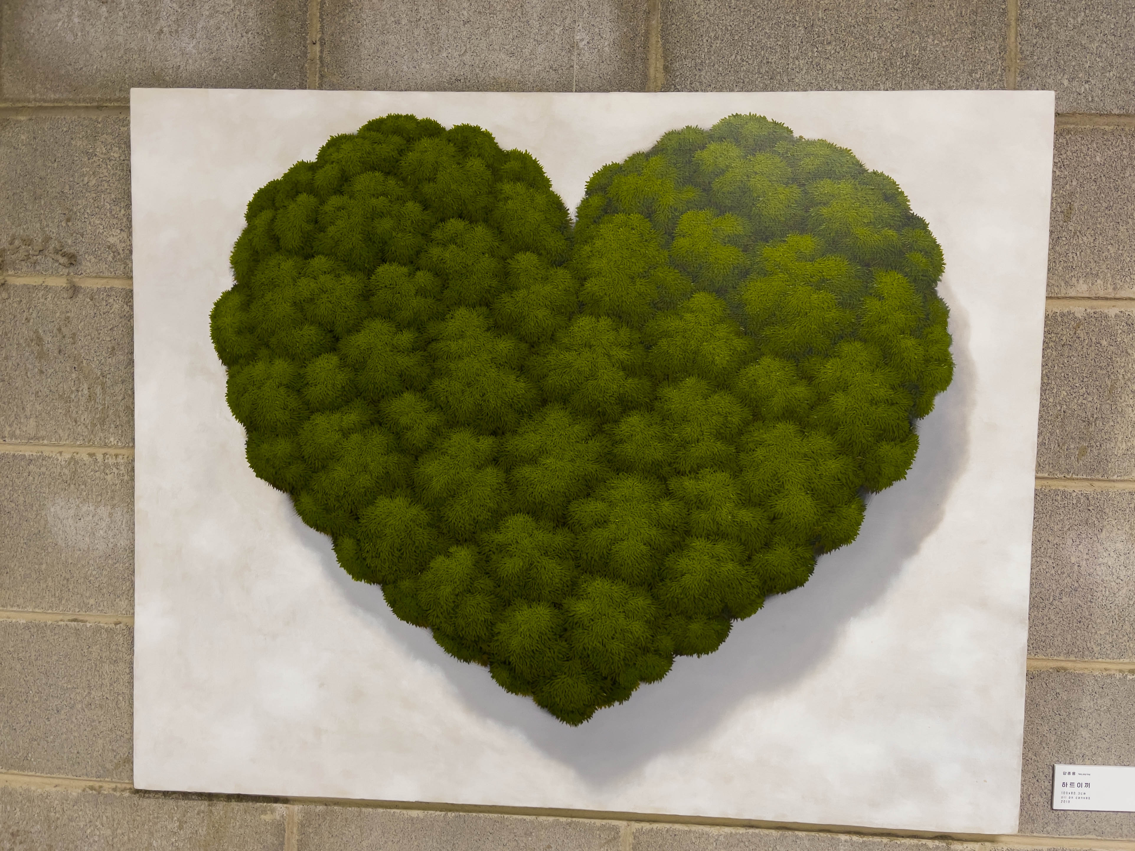 양종용 작가님은 이끼를 테마로한 유화 작업을 하는데 이끼들을 자세히 보다보면 붓칠 하나하나가 보이며 푸르름이 돋보이는 작품입니다. 작가님은 작품 하나하나를 자연스러운 어울림을 표현하고자 한 작품들이 많이 있는데 그 어울림의 하나를 표현하기 위해 작품마다 이끼를 선택하였다고 합니다.
