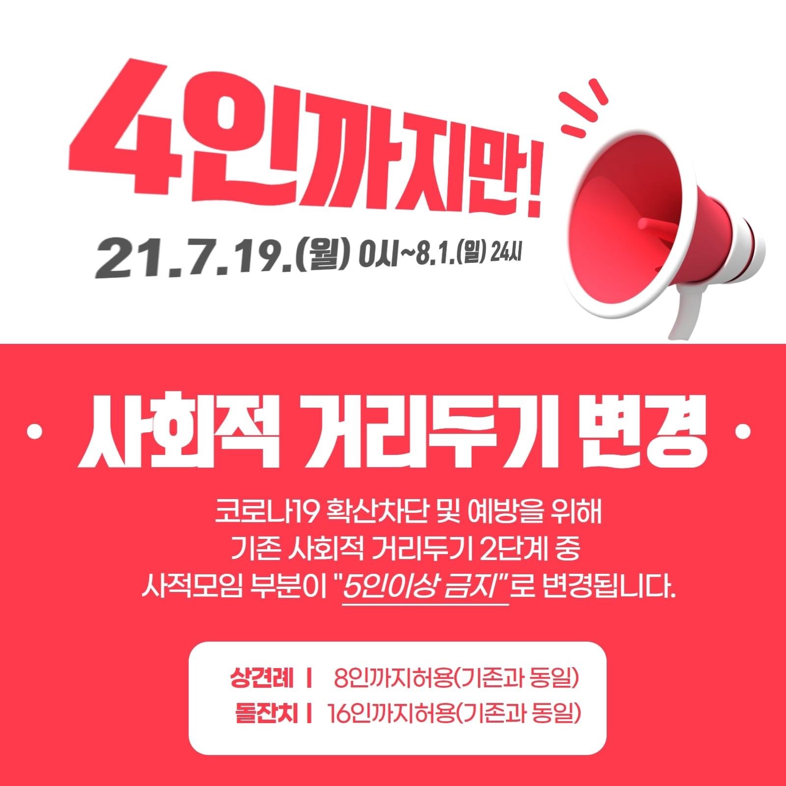 ①(기간) 2021.7.19. 00:00~2021.8.1. 24:00 ②(인원) 5명부터 사적인 모임 금지 |