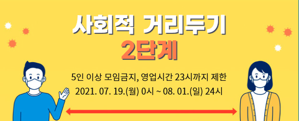 코로나바이러스감염증-19 예방 및 확산을 차단하기 위하여 울산 사회적 거리두기 2단계 행정조치가 실행이 되었습니다.
