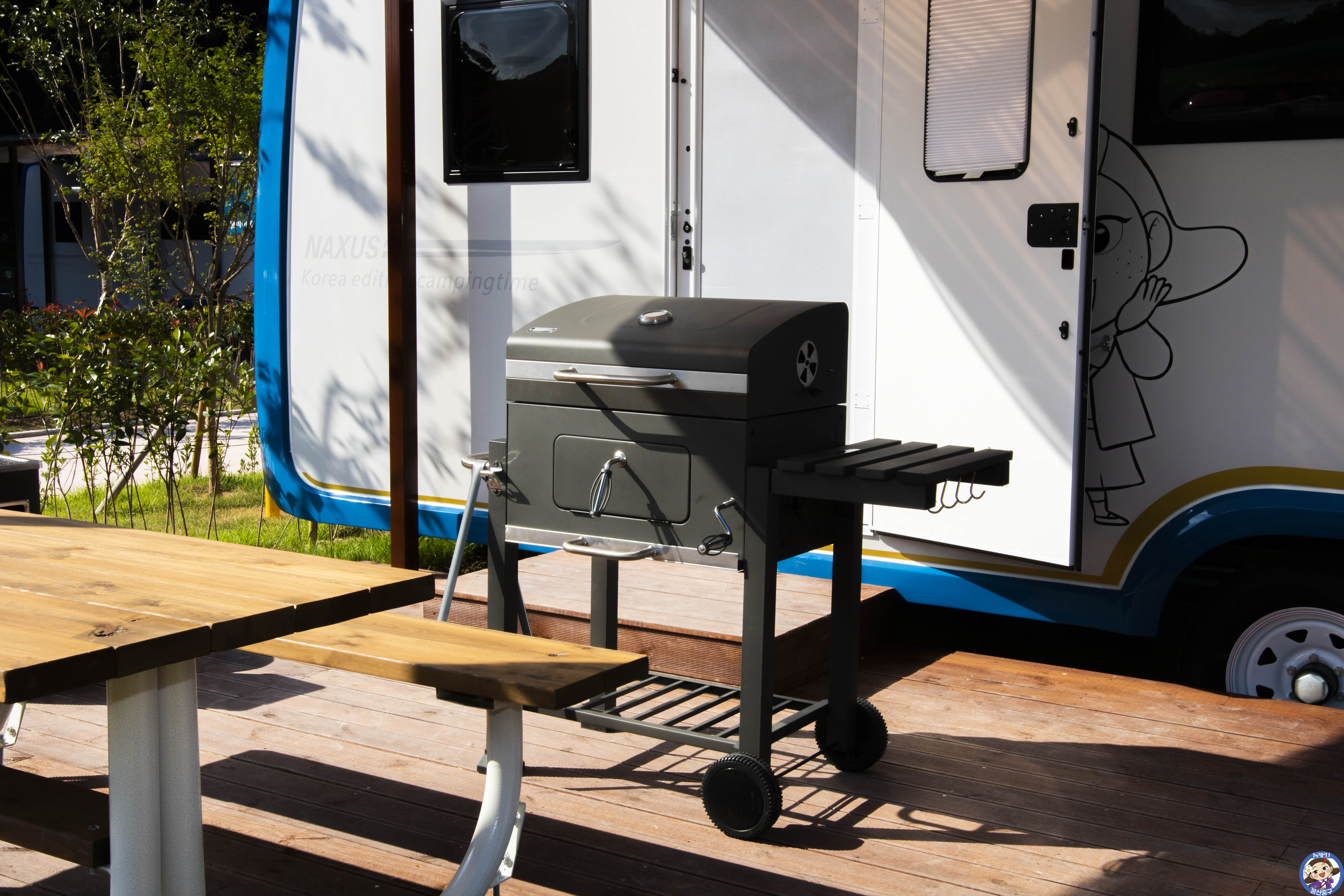 카라반 앞에는 큰 데크위에 식탁+바베큐그릴도 준비되어 있습니다.