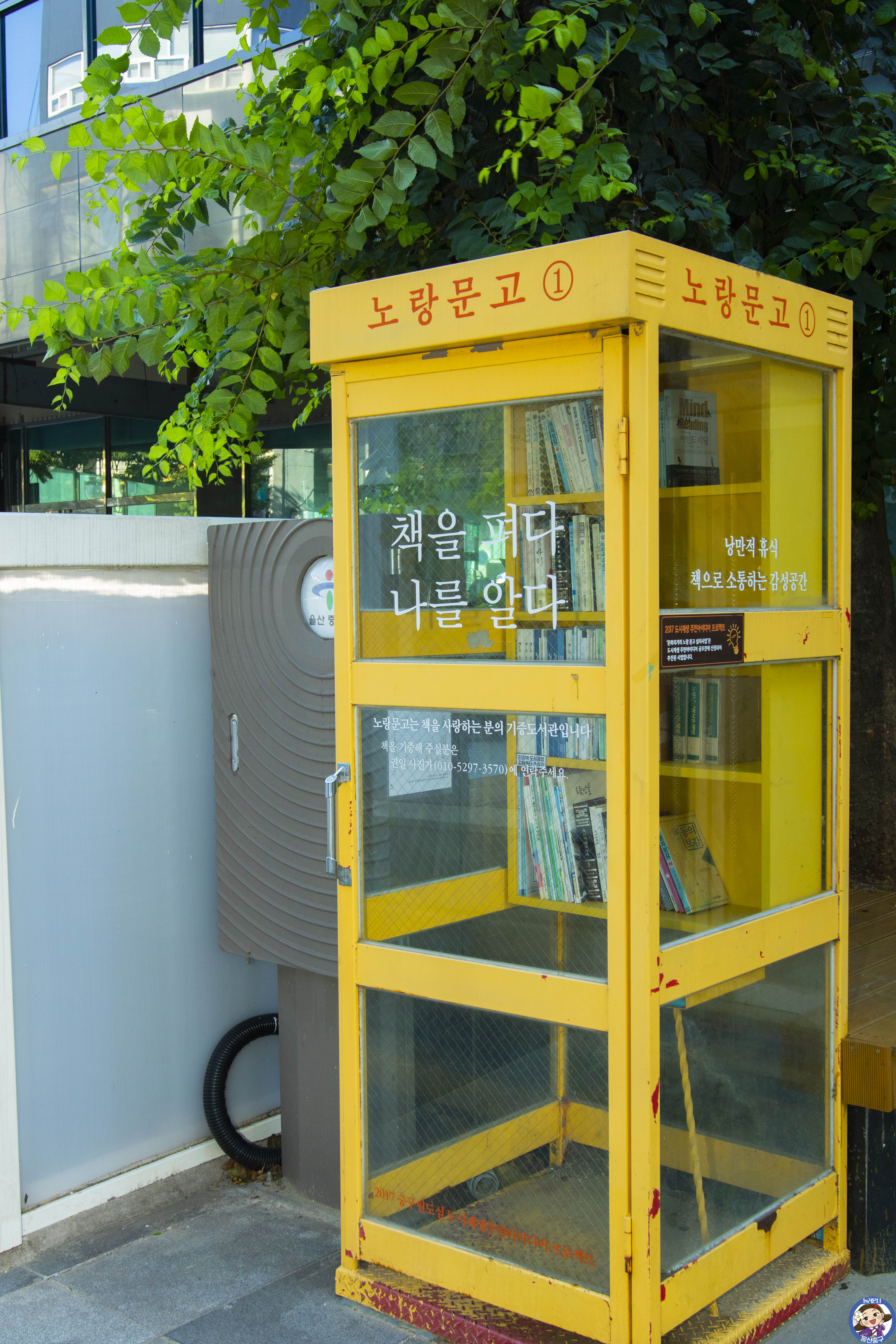 눈에 확 띄는 색깔로 거리를 지나는 사람들이 한번쯤 뒤돌아보게 만드는 이 공중전화 부스의 정체는 다름 아닌 무인도서관 입니다.