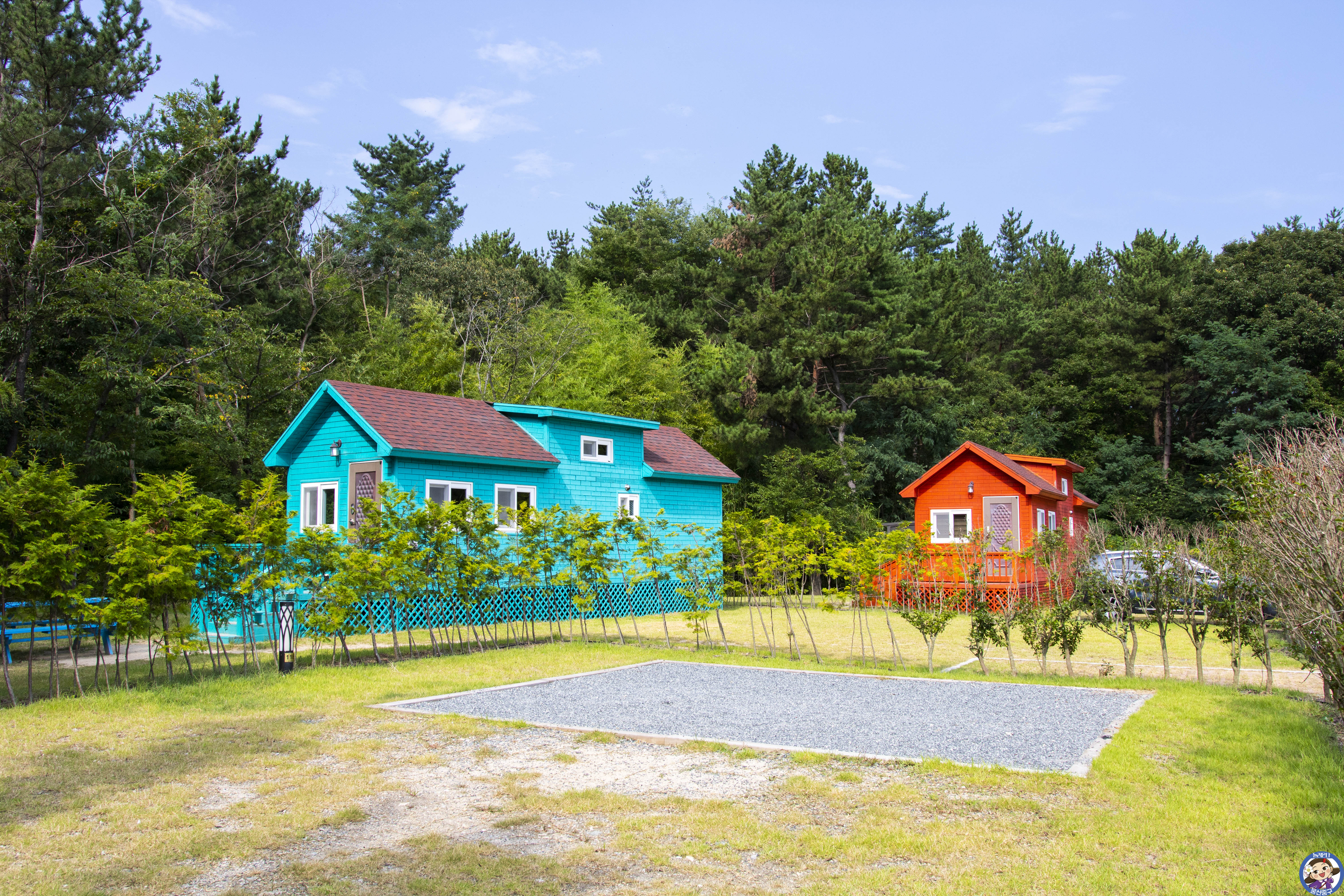 다른 캠핑장보다 조용한편이고 3개의 캐빈형 카라반은 각기다른 색으로 마치 숲속의 별장같은 느낌이 듭니다.