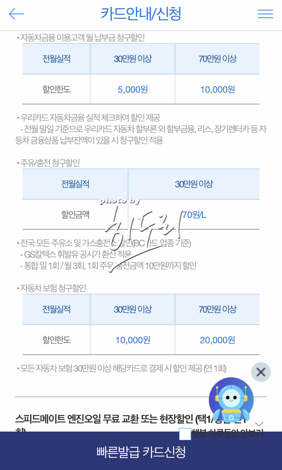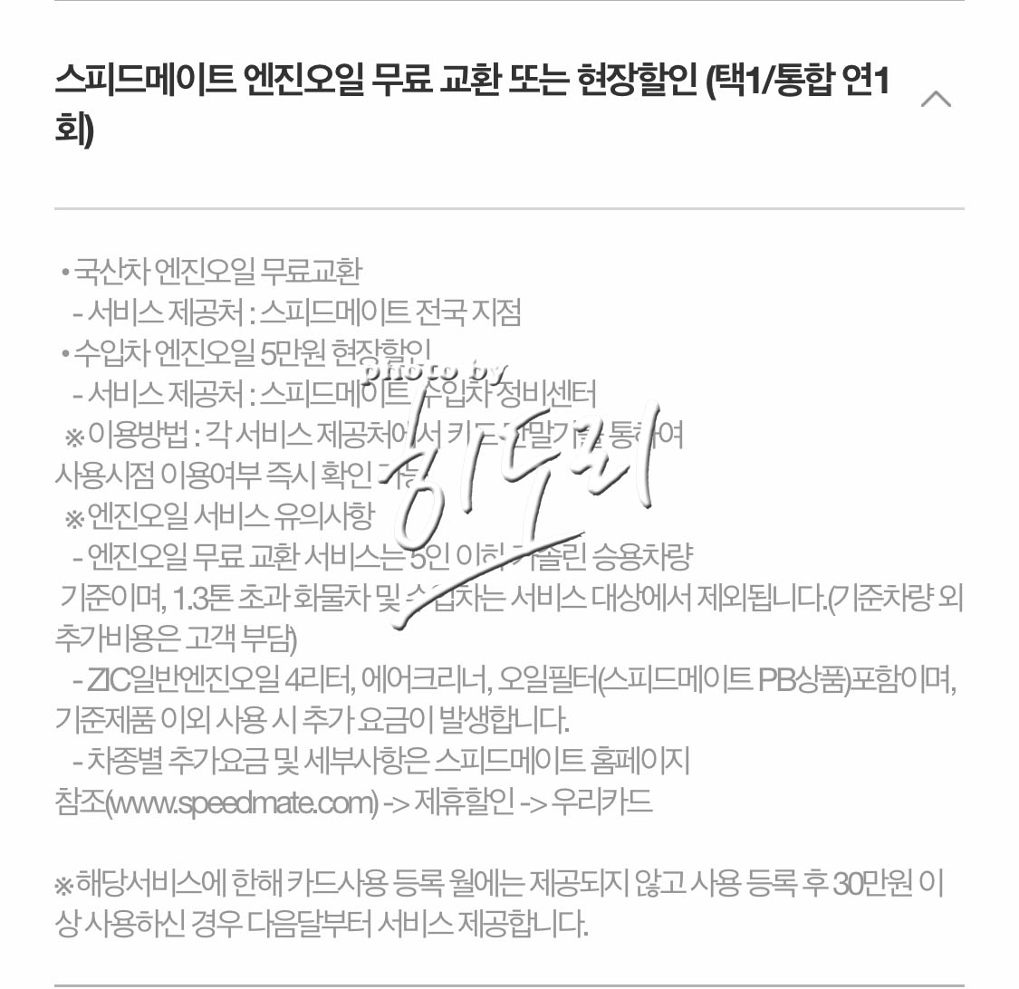 그나마 사용할수 있는 헤택은 스피드메이트 엔진오일 무료교환 + 70만원 실적 사용시 자동차 할부금 만원 할인...