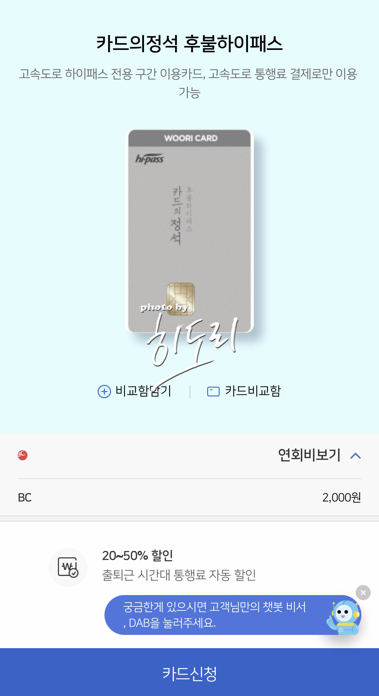 하이패스 연회비는 년2000원이지만 그래도~ 카드쓰면 할인해준다고 하니... 이제 우리카드를 쭉 사용해야되는 이유가 하나 생겼네요.