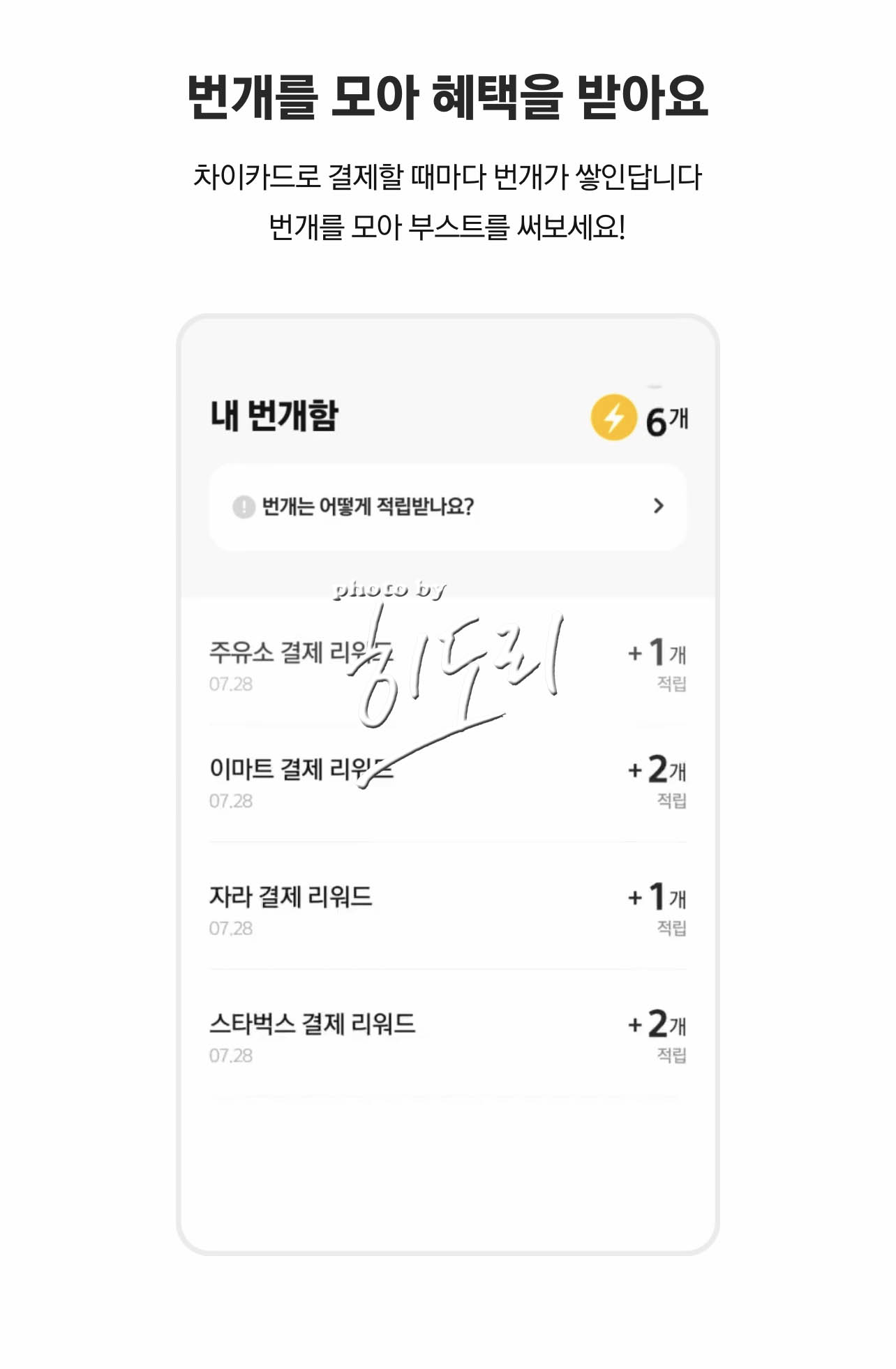 차이카드로 결제할 때마다 번개를 모을수가 있습니다.