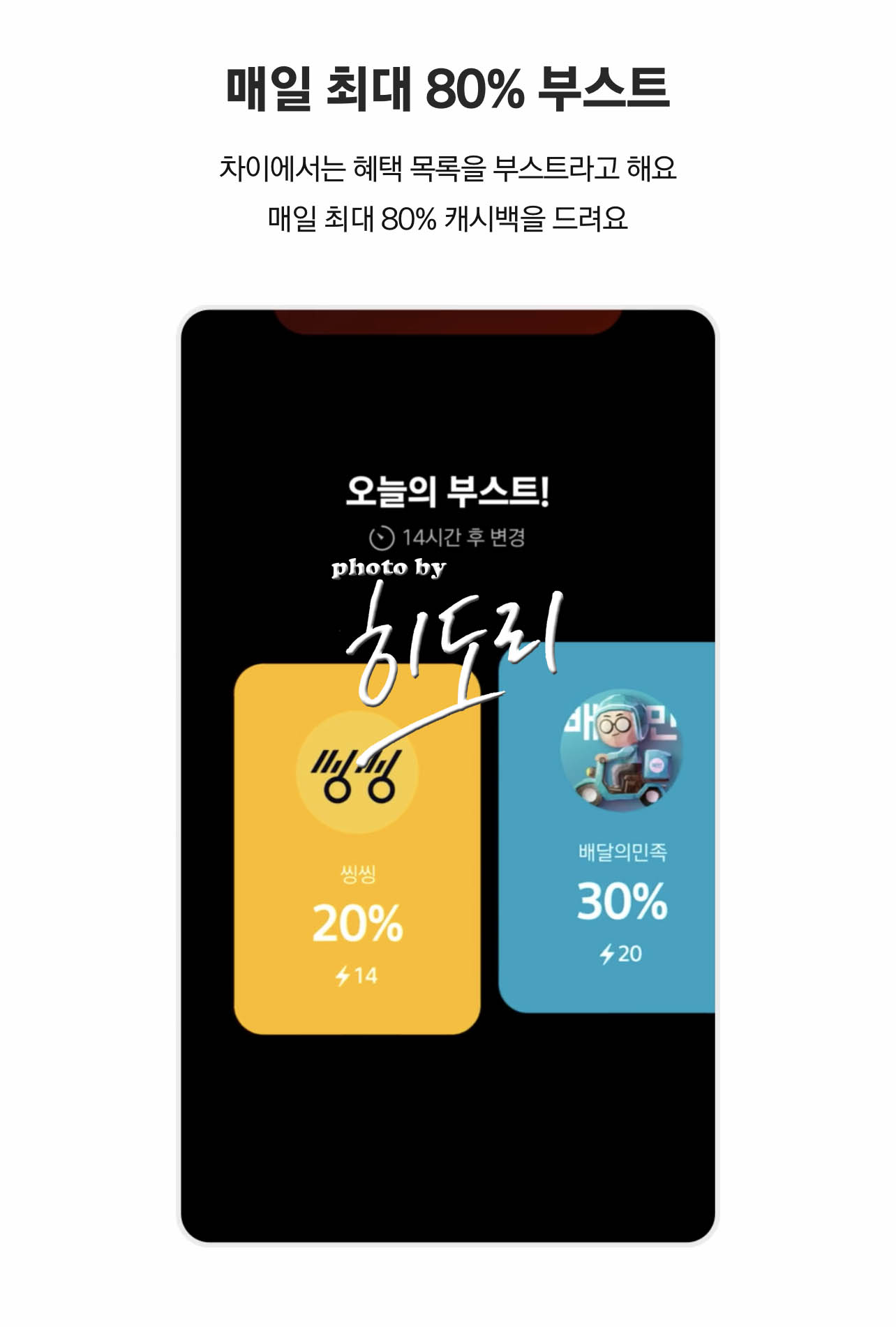 스타벅스에서 차이카드로 결제할 때 부스트를 통해 20% 할인을 받을 수 있다면, 할인 부스트를 사용하기 위해 번개 10개를 사용해야 되는것이죠.