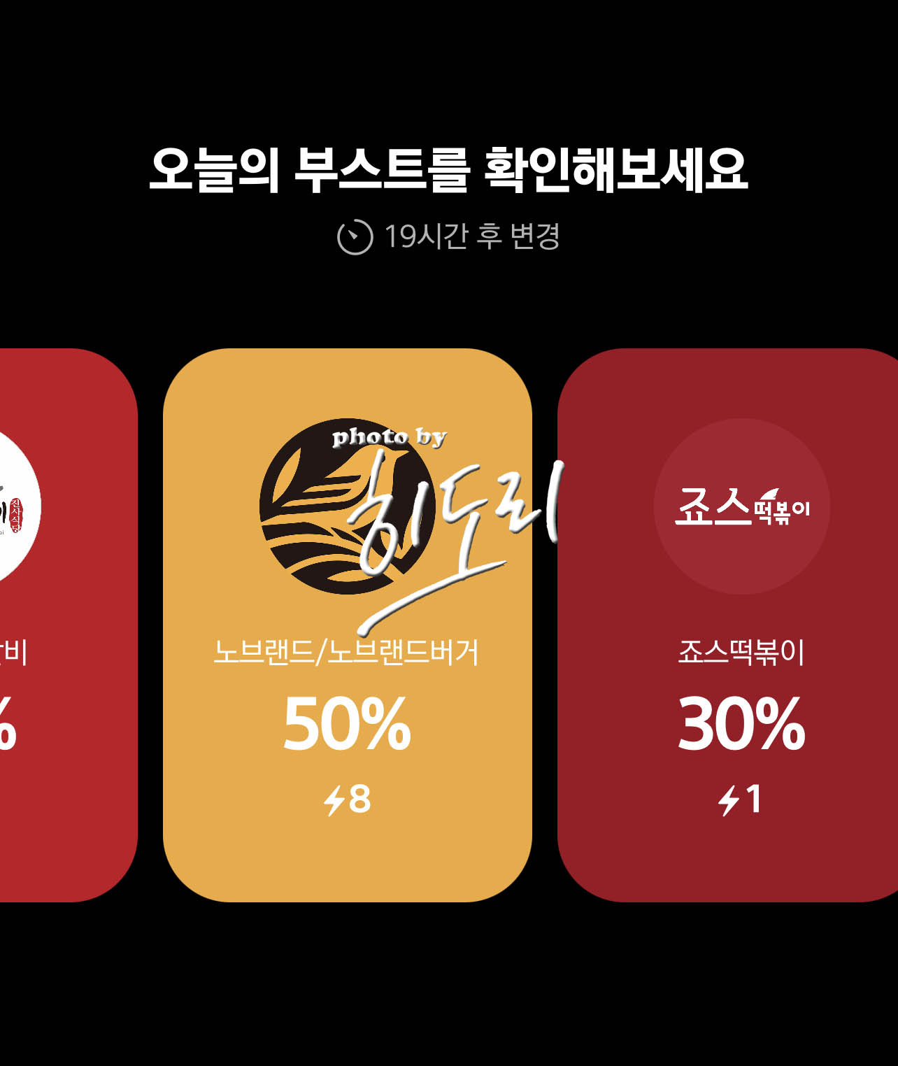 그리고 할인 부스트를 쓸 수 있는 가맹점과 할인율 매일 12시에 새롭게 바뀝니다.