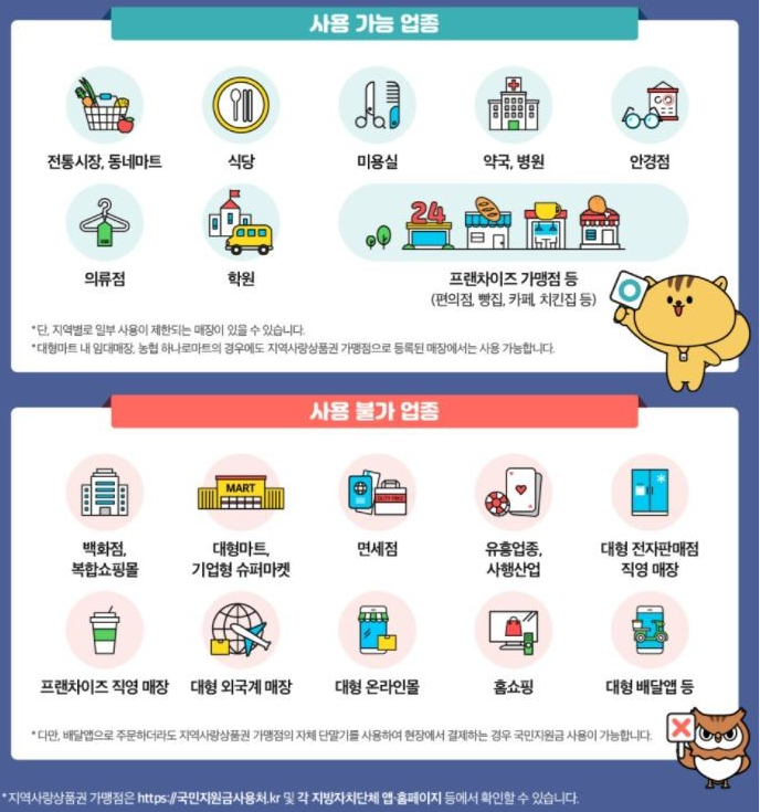 또한 사행산업과 유흥, 백화점, 인터넷 몰, 대형 외국계 매장, 면세점, 기업형 슈퍼마켓, 홈쇼핑 등은 사용불가능 합니다.