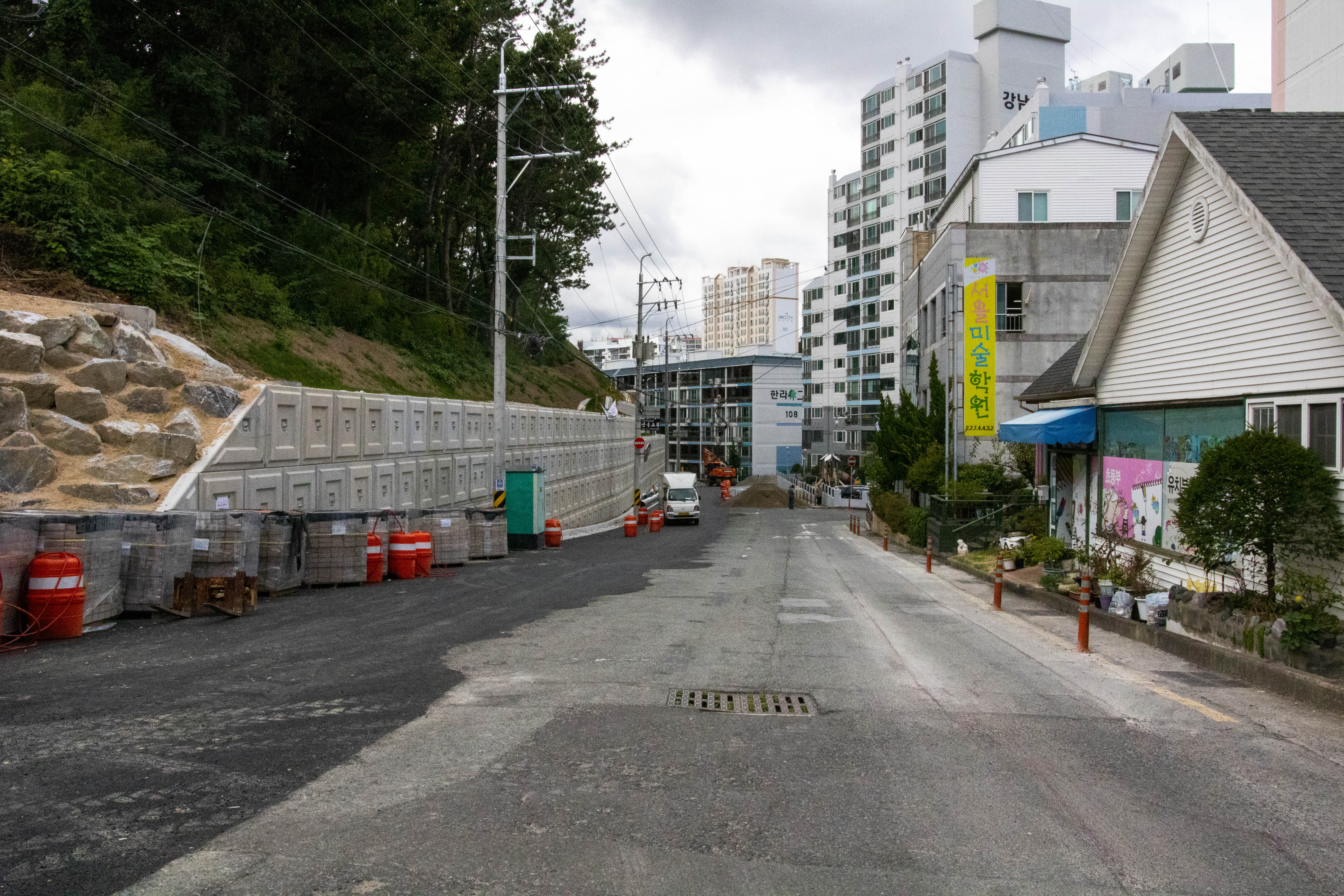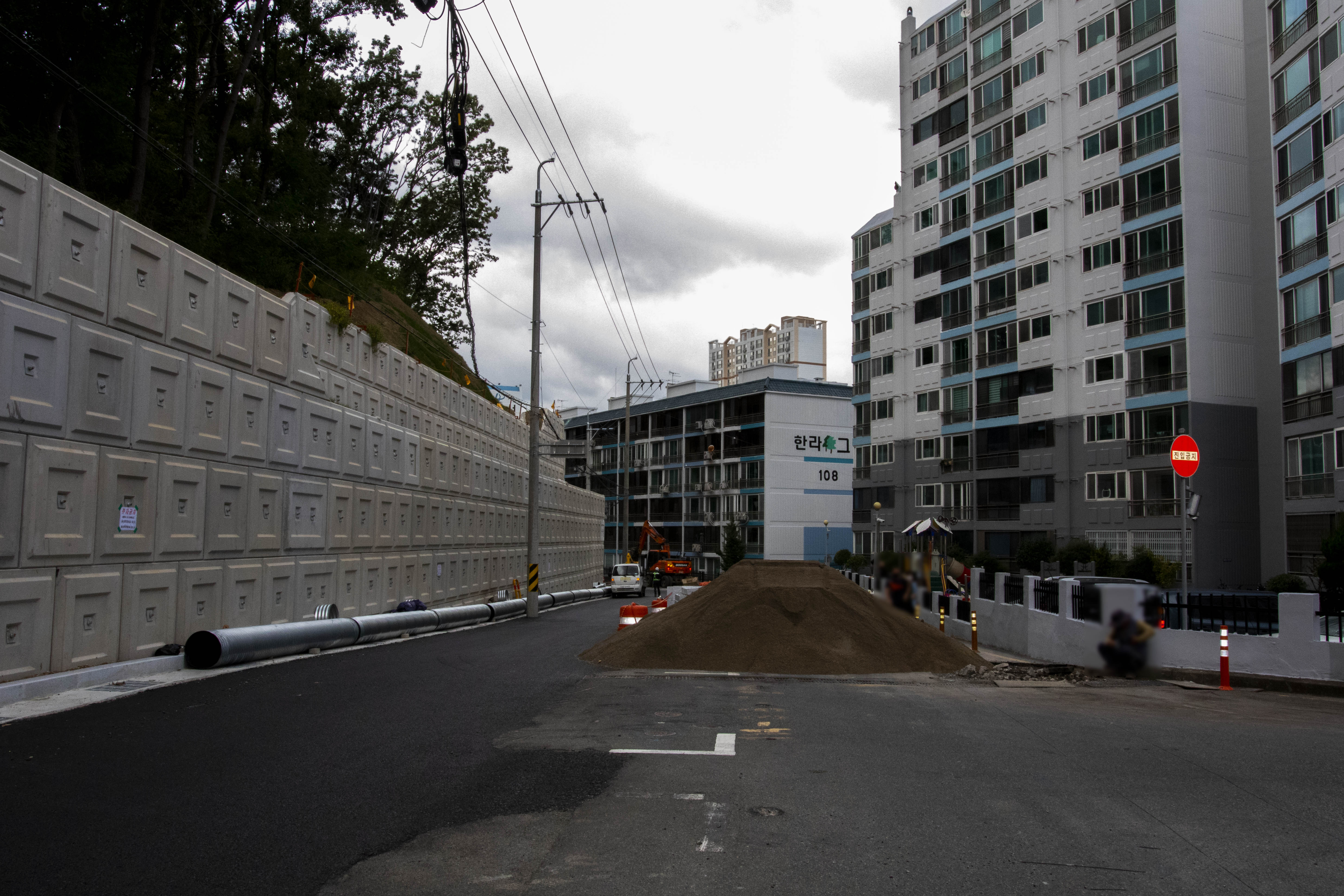 410m 길이의 일방통행 도로 구간의 폭을 기존 8m에서 13m로 늘려 양방통행이 가능하도록 도로공사가 진행 중 입니다.