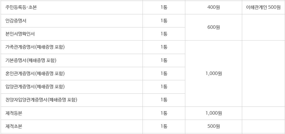 민원수수료는 많이 사용하는 서류들만 보자면!