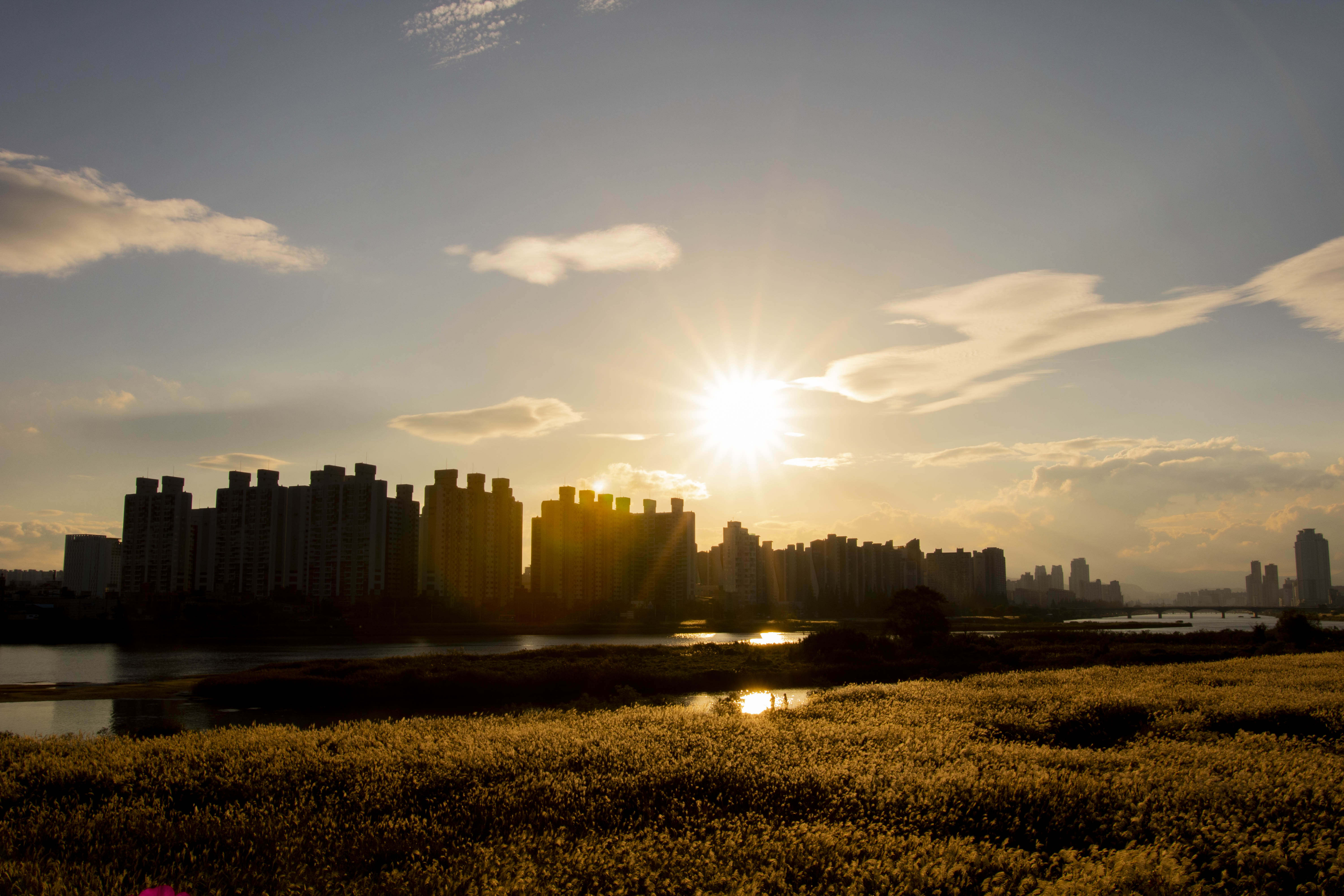 맑은 하늘아래 해가 도심지 뒷편으로 지는순간