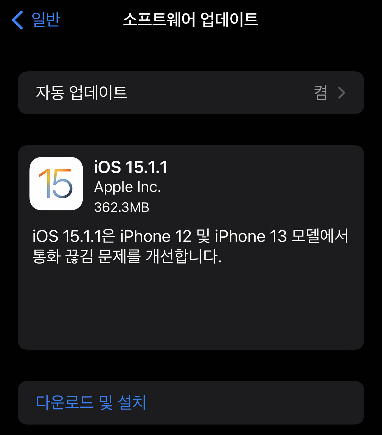 iOS 15.1.1 애플은 기존 iOS 15.1의 업데이트 버전으로, 통화 끊김 현상이 발생한 아이폰12와 아이폰13에서만 적용됩니다.