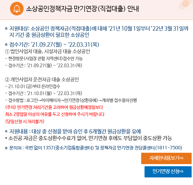 소상공인 정책자금에 대해 21년 10월 1일~22년 3월 31일까지 원금상환이 필요한 소상공인 경우 6개월간 원금상환을 유예