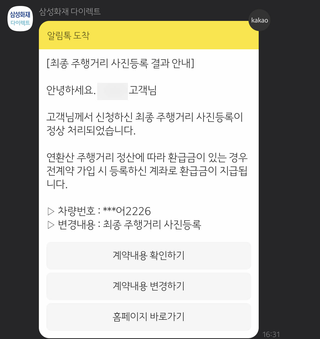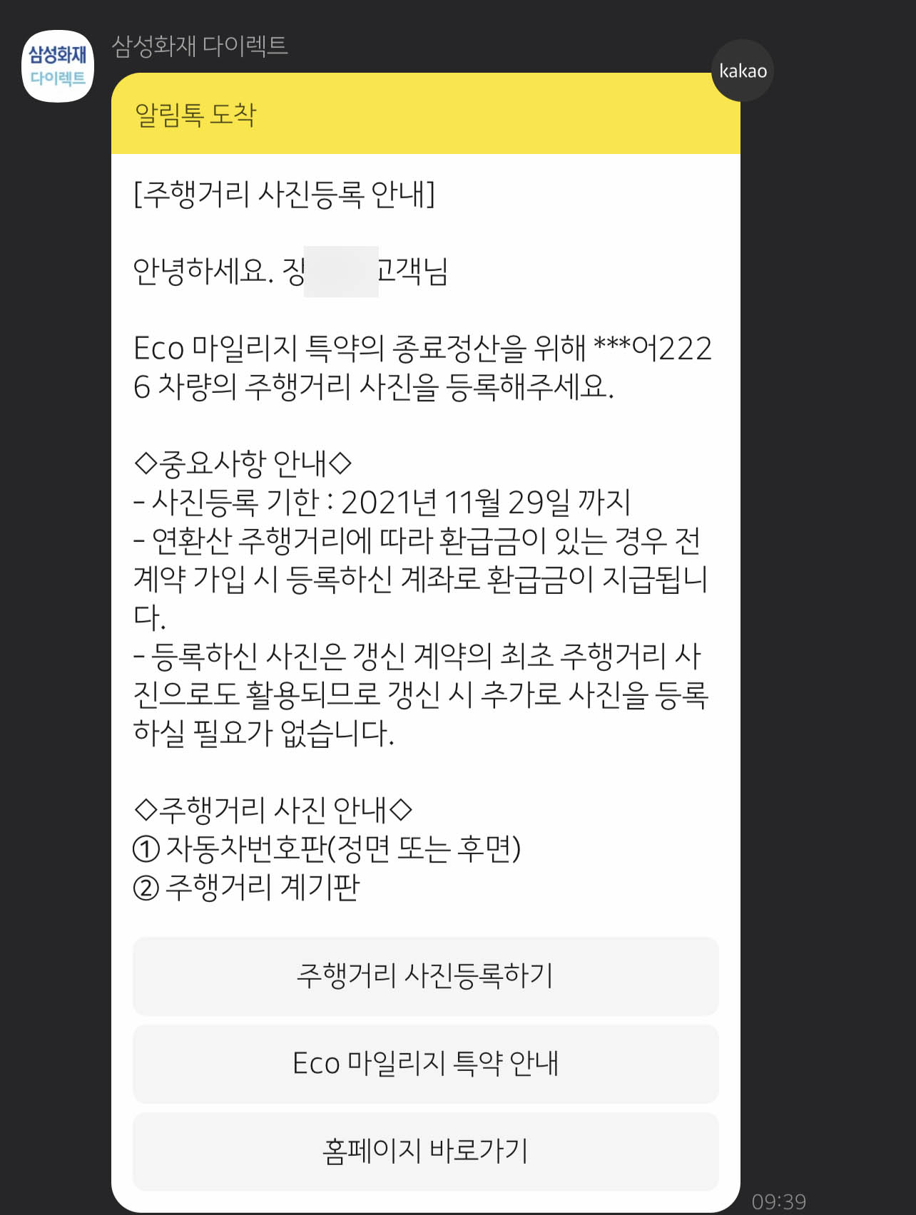 보험만기가 다 되어 가니 카톡으로 주행거리 마일리지 등록을 하라고 미리 문자가 날라옵니다.