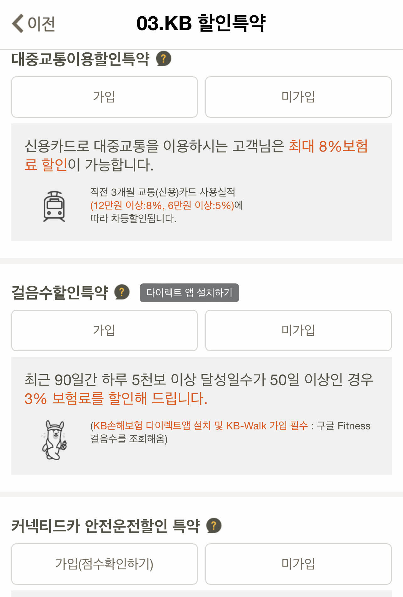 국민자동차보험인 경우 걸음수할인특약,커넥티드카 안전운전 할인이 있는데 커넥티드는 현대차인 경우 블루링크 기아차는 기아커넥터로 가속,속도위반등을 계산해 안전운전 점수를 통계로 가입을 할수가 있습니다.