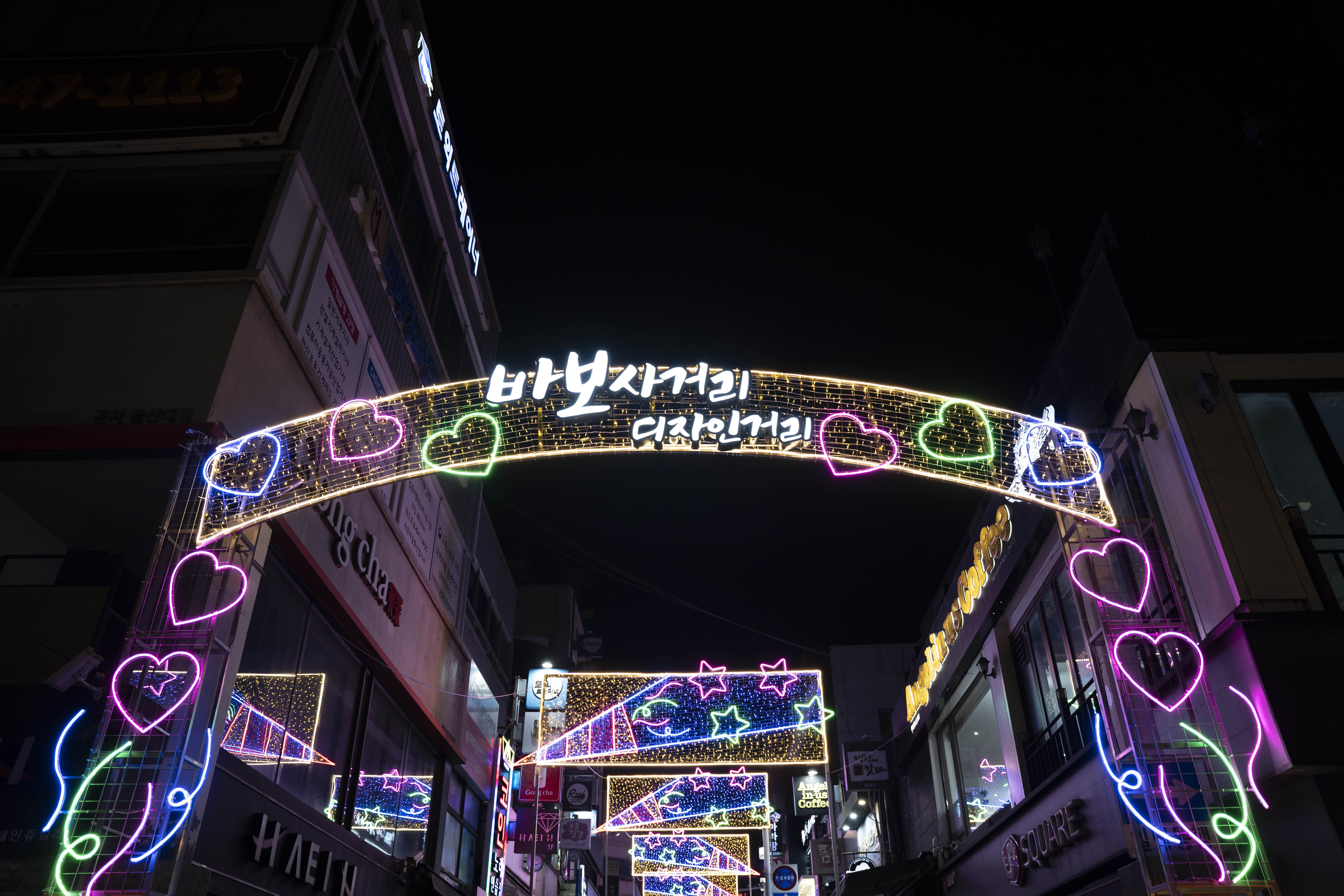 바보사거리디자인거리는 게이트 조명과 일루미네이션, 별 조형물로 꾸며져 있는데 알록달록한 조명들로 환상적인 분위기가 연출이 되는곳 입니다.
