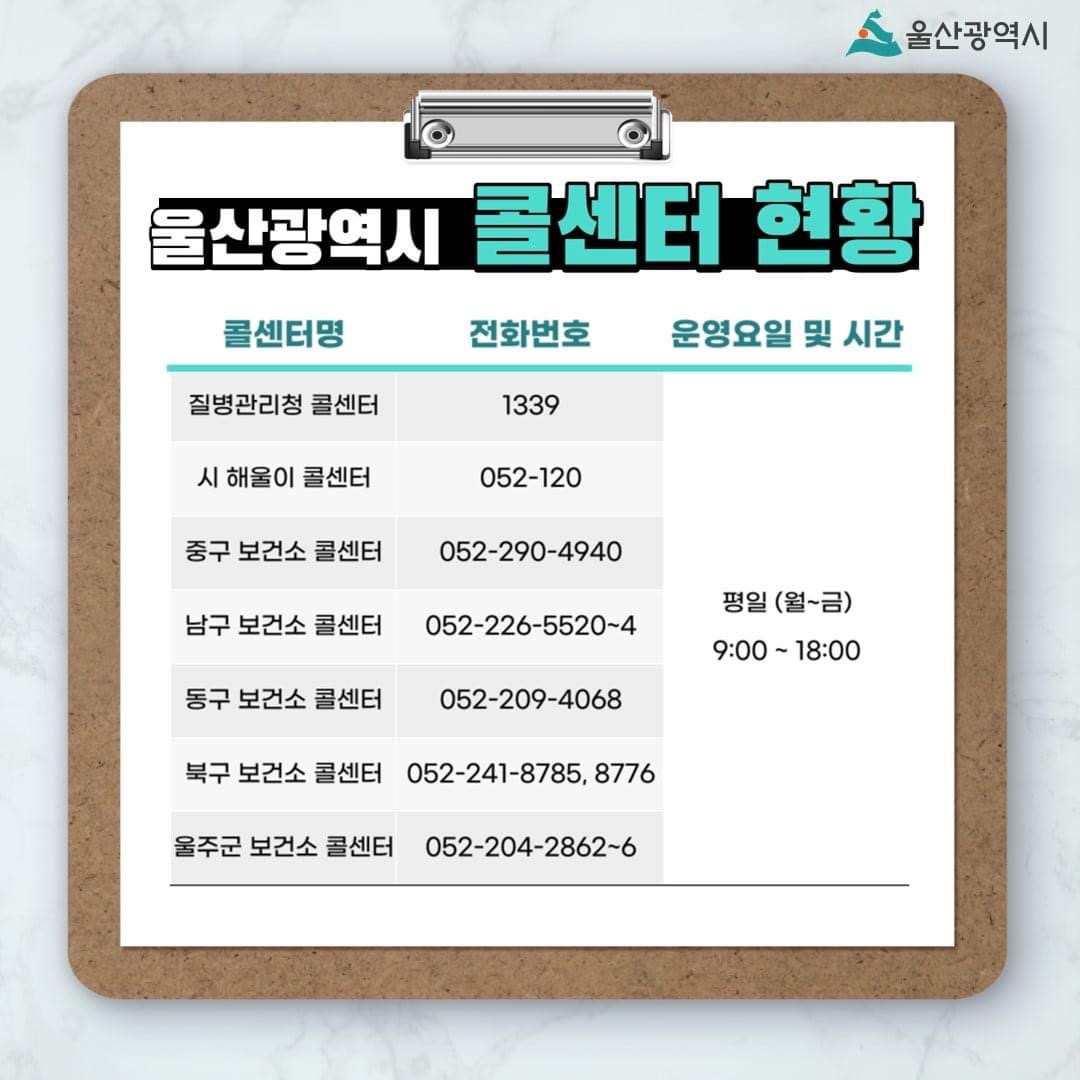 울산광역시 보건소 콜센터 전화번호와 울산 코로나 예방접종 시행기관 안내도 입니다.