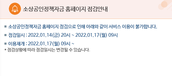 그리고 소상공인정책자금 누리집 홈페이지는 1월14일부터 1월17일까지 서버점검을 하므로 홈페이지에서 필요한 서류나 대출신청이 필요하신 소상공인분들은 14일 이전에 이용하시기 바랍니다.