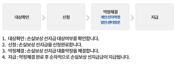 - 손실보상금 지급 전 일정금액을 무이자 대출로 우선 지급하는 새로운 손실보상 방식입니다.
