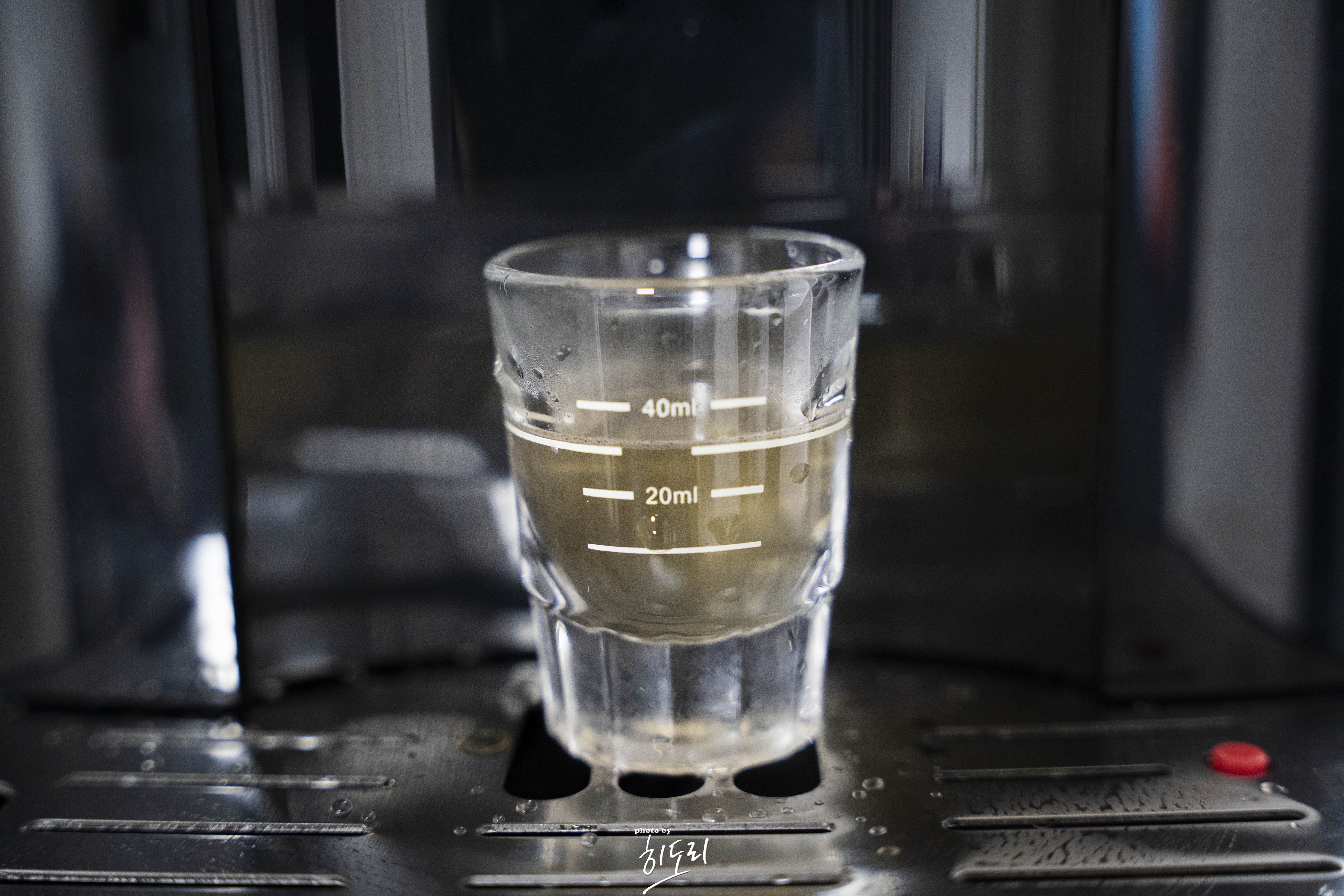추출하기전 살짝 물이 나오는데 이건 더 진한향을 위해 원두를 물에 적신 후 추출이 되는 과정 입니다.