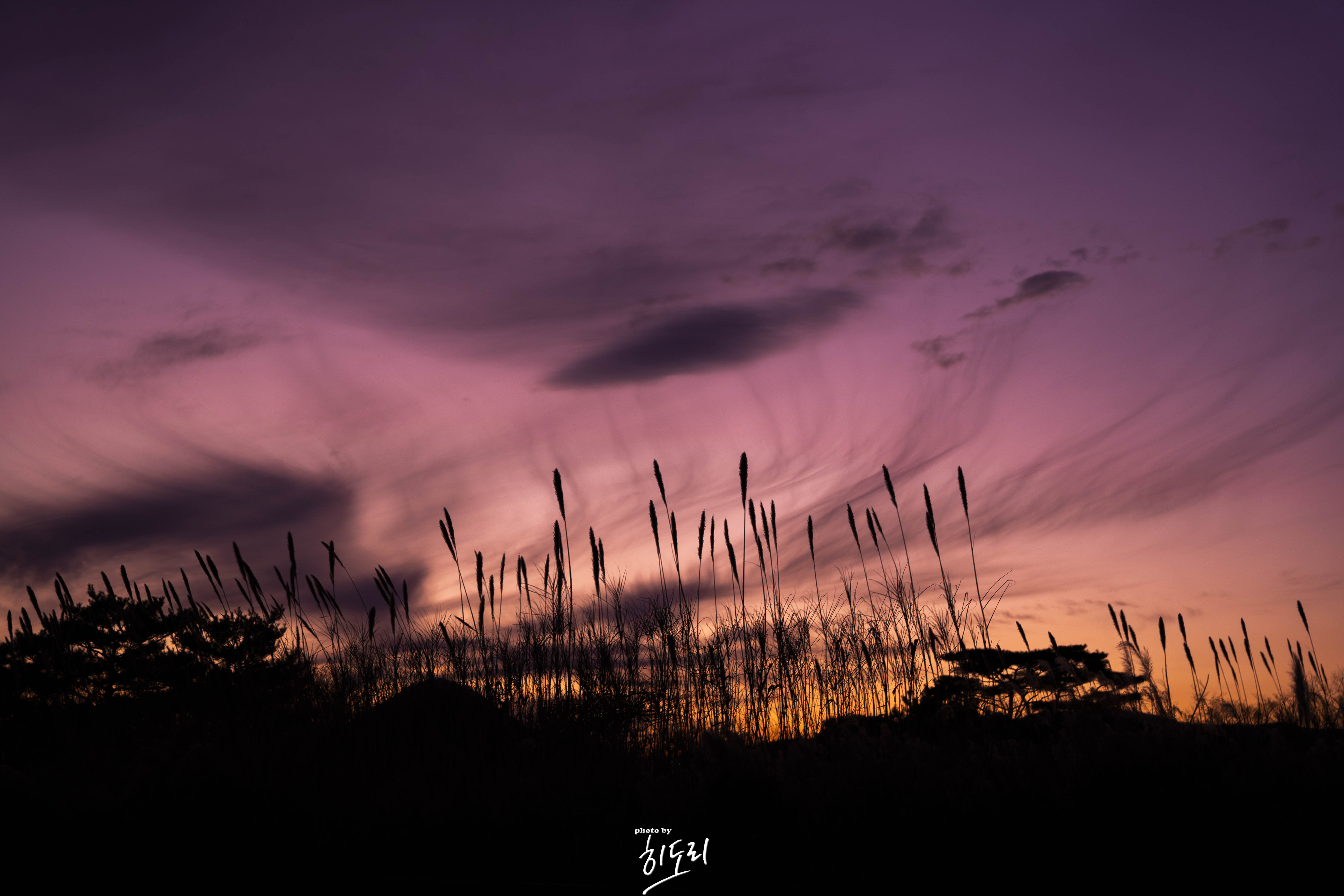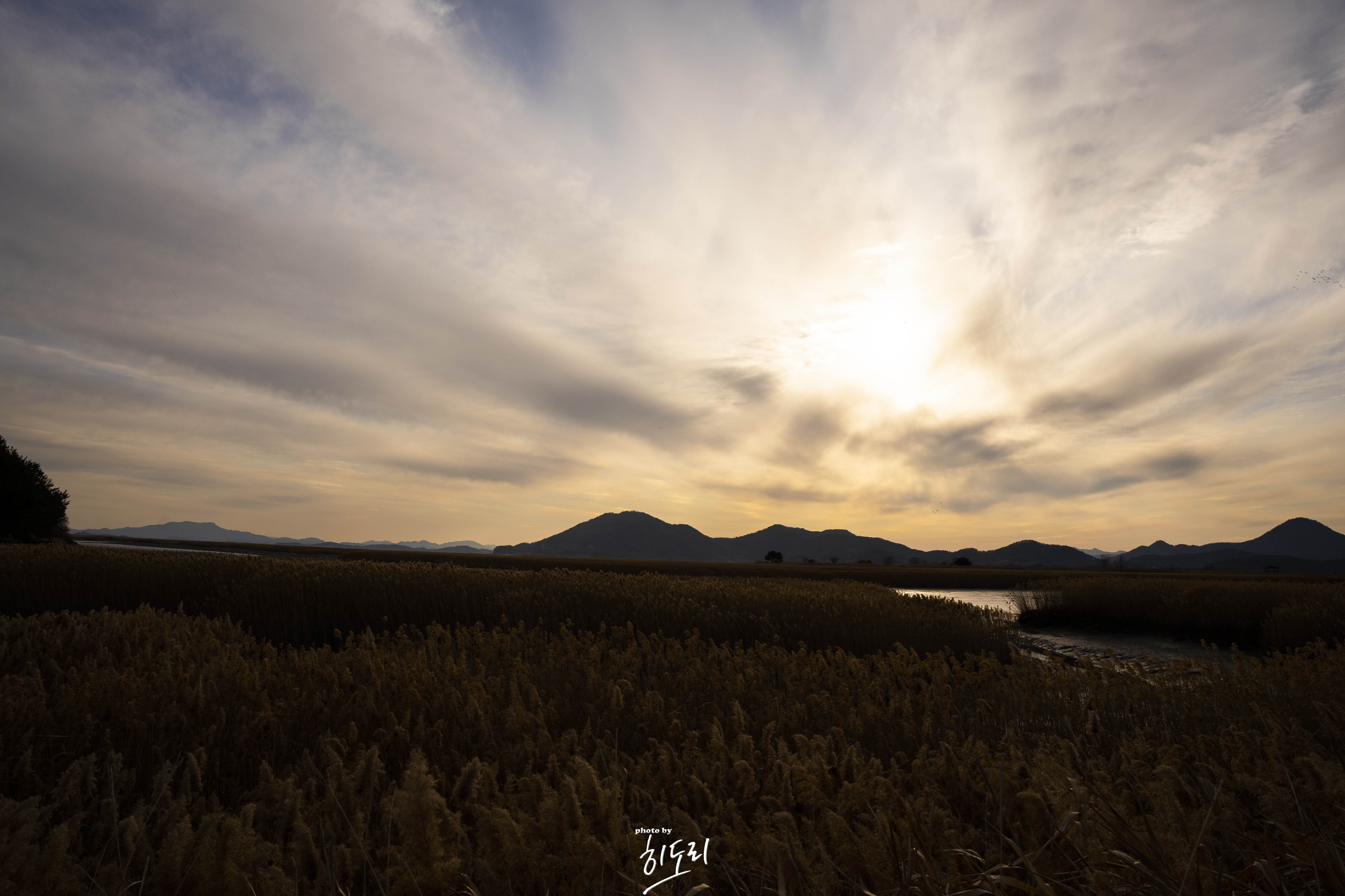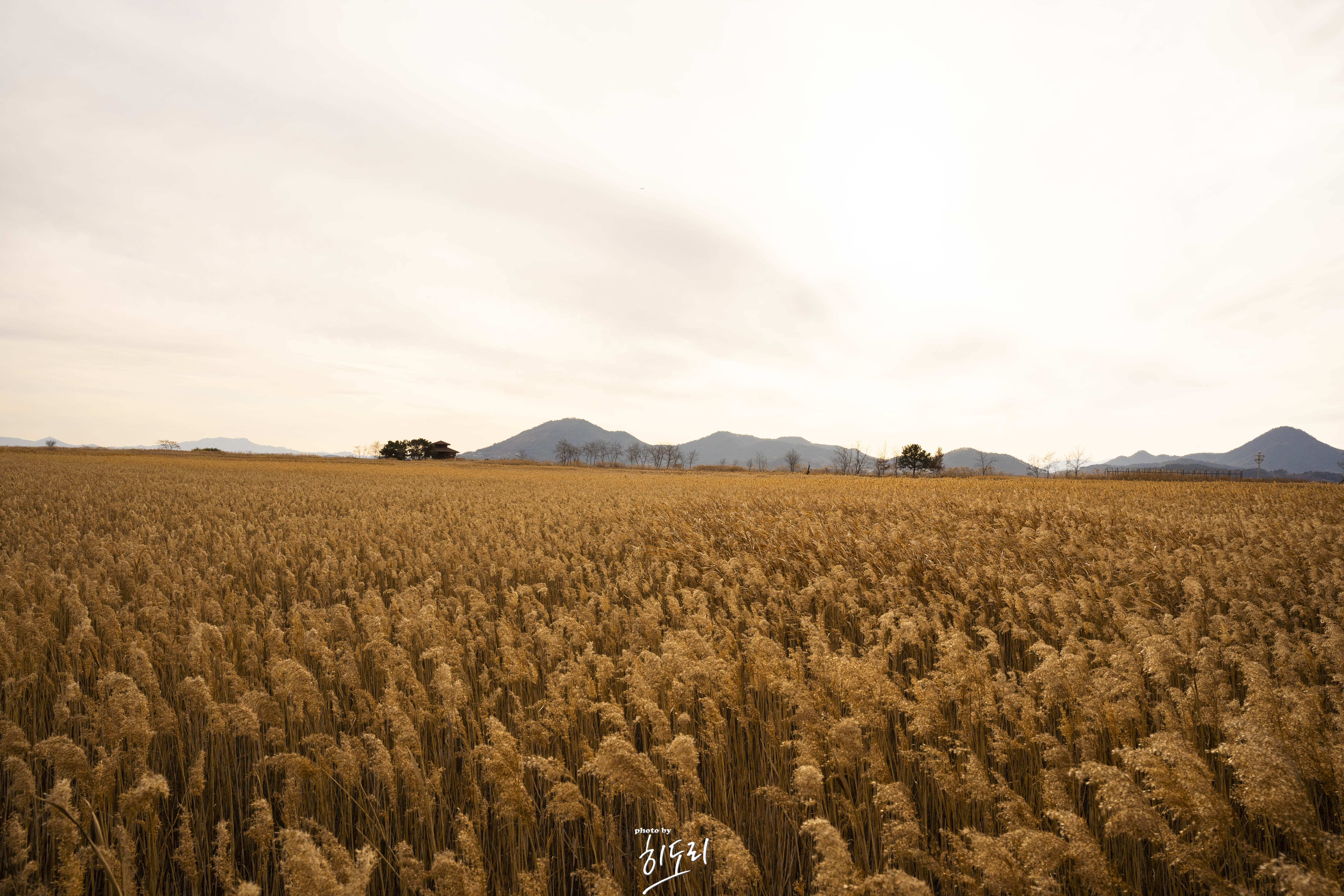 산이 없는 곳은 노을녘의 그늘이 없어서 노란 노을빛깔로 갈대들을 더 아름답게 비춥니다.