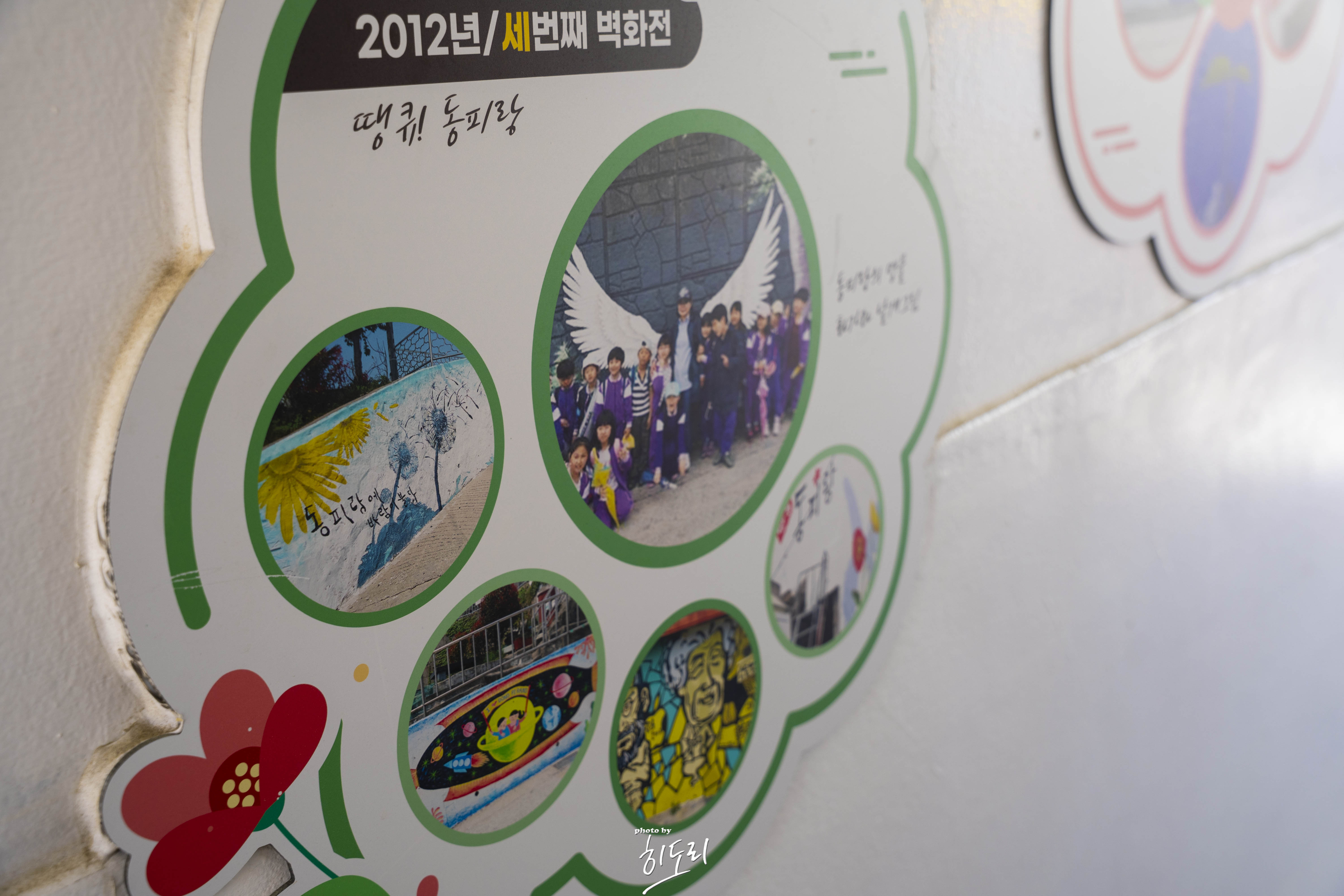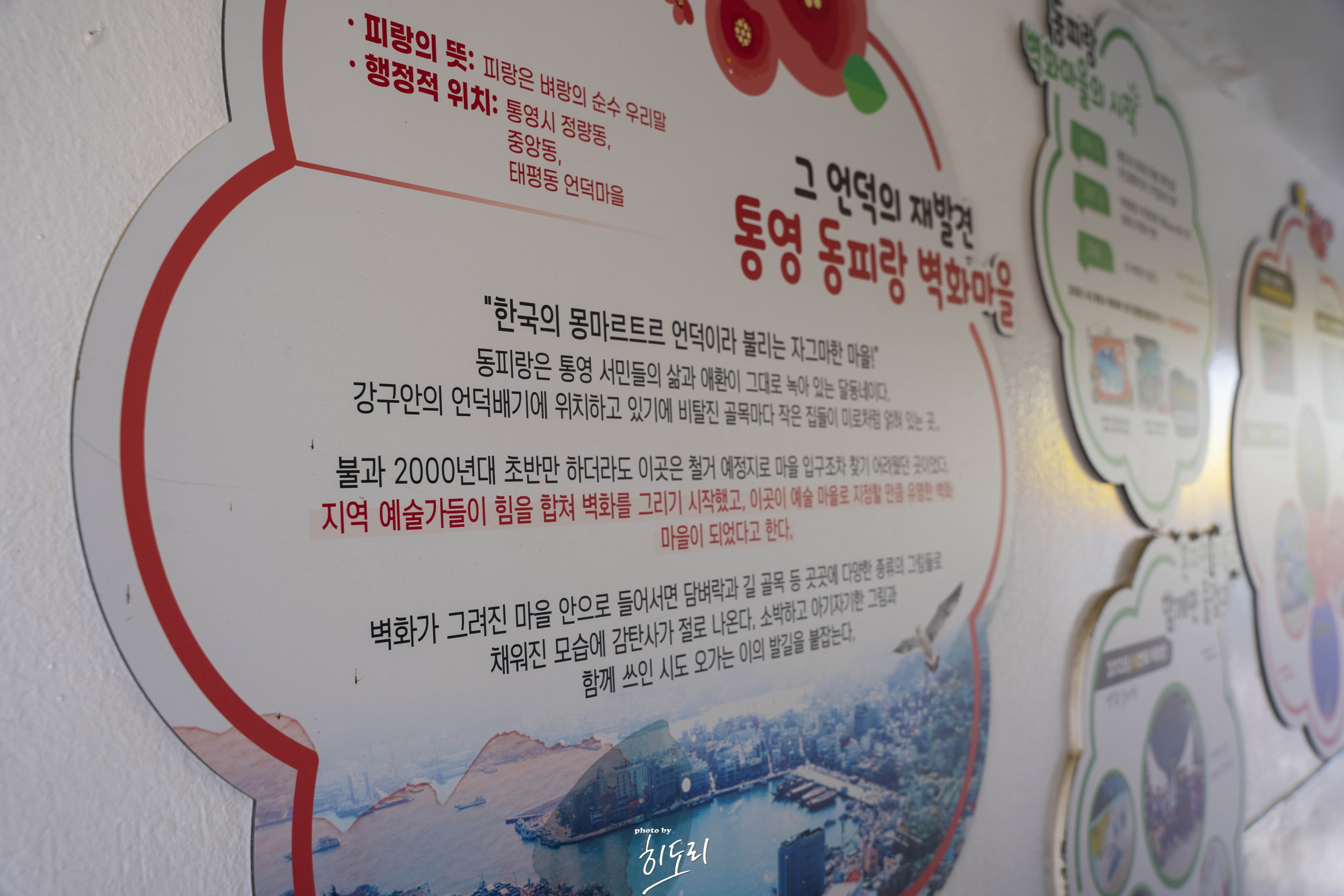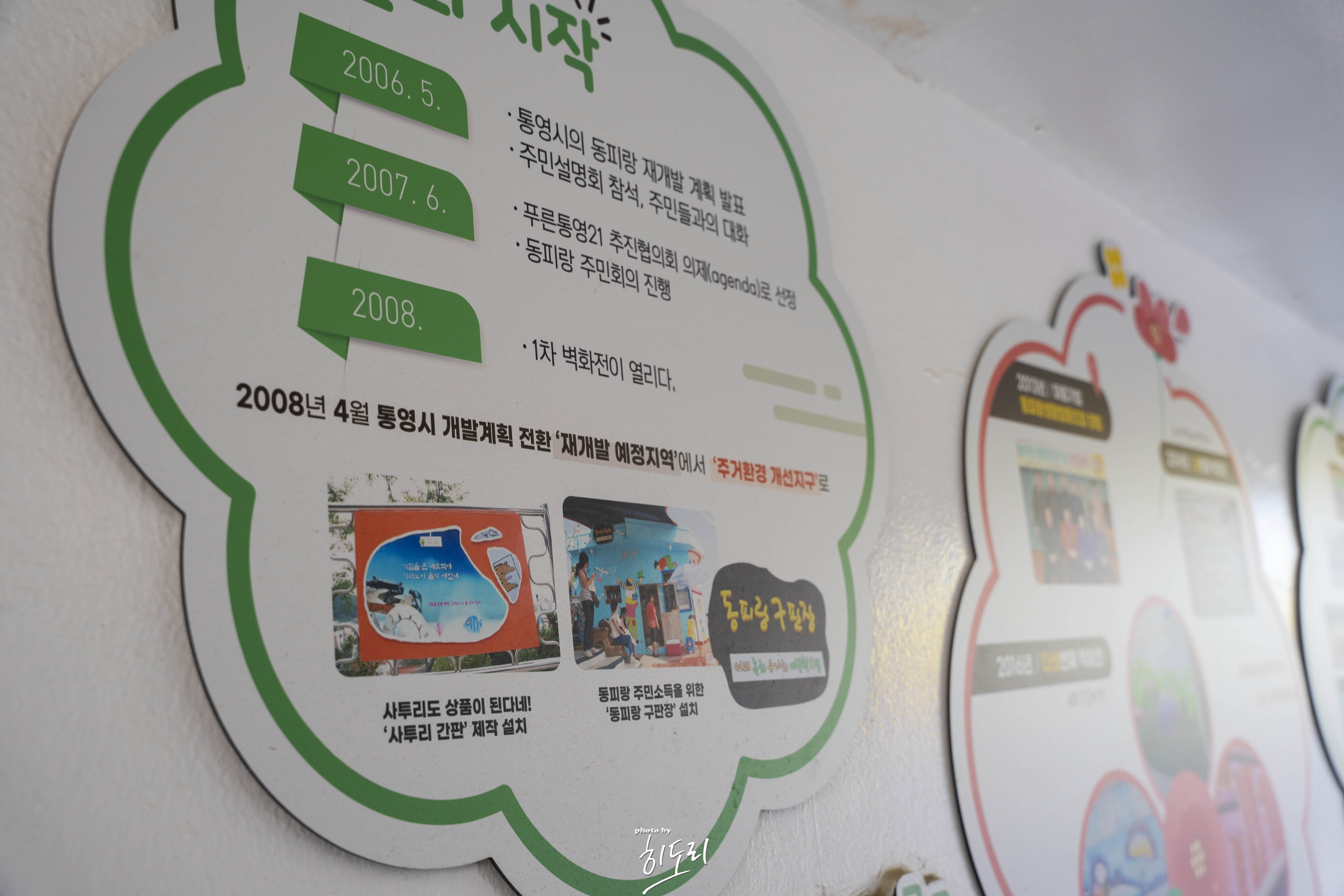 2007년 10월 ‘푸른통영21’이라는 시민단체가 동피랑 색칠하기-전국벽화공모전을 통해 전국 미술대학 재학생과 개인 등 18개 팀이 낡은 담벼락에 아름다운 벽화를 그렸다고 합니다.
