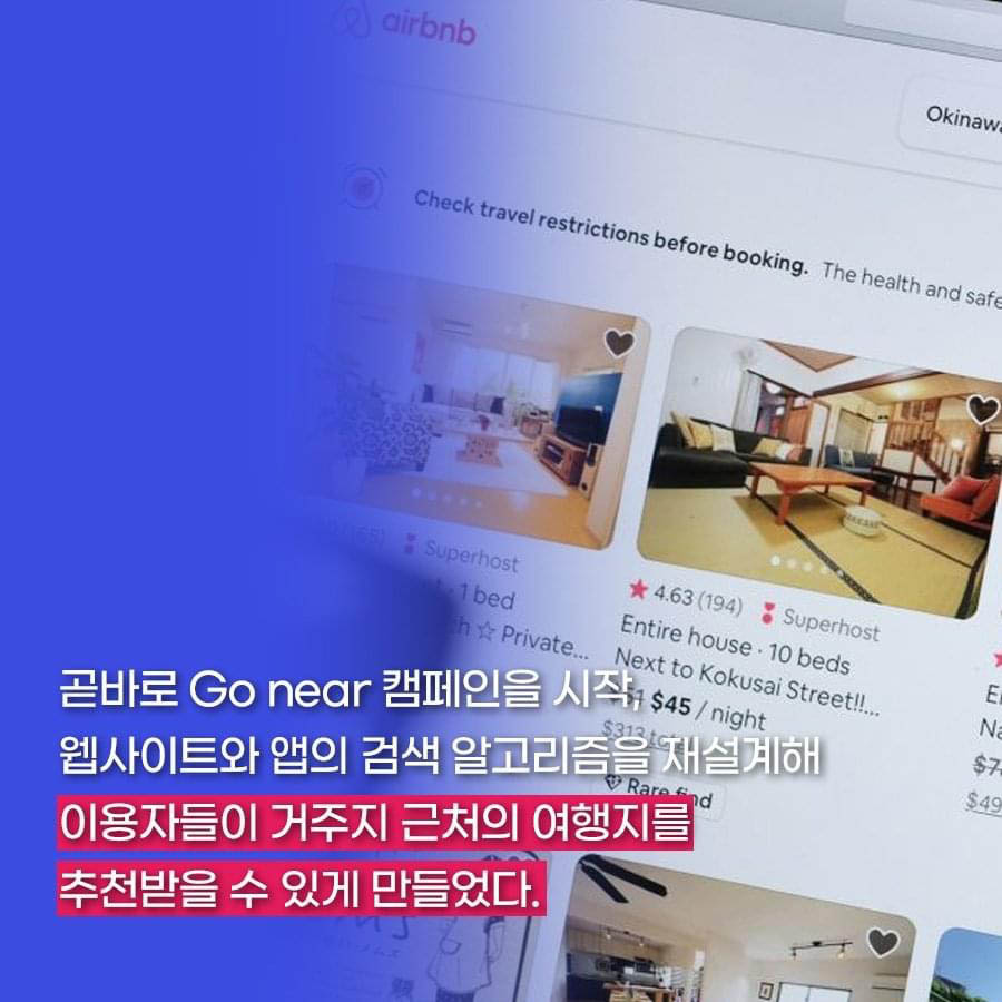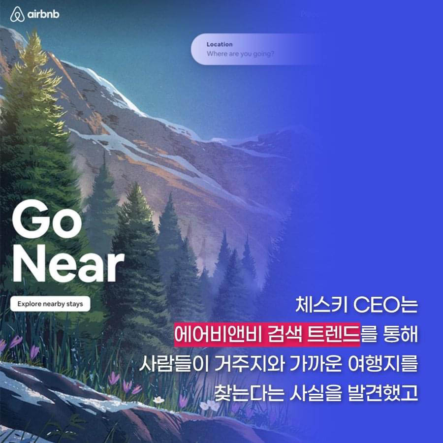 체스키CEO는 에어비앤비 검색 트랜드를 통해 사람들이 거주지와 가까운 여행지를 찾는다는 사실을 발견하고 곧바로 GO near 캠페인을 시작하며 이용자들이 거주지 근처의 여행지를 추천받을 수 있게 만들었습니다.