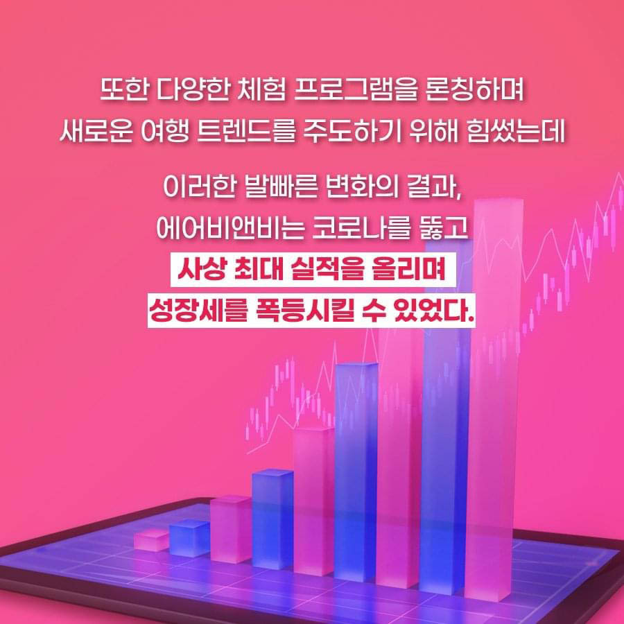 또한 다양한 체험 프로그램을 론칭을 하며 새로운 여행 트렌드를 만들고 변화를 했기에 현재의 에어비앤비는 살아남을수 있지 않았을까요?