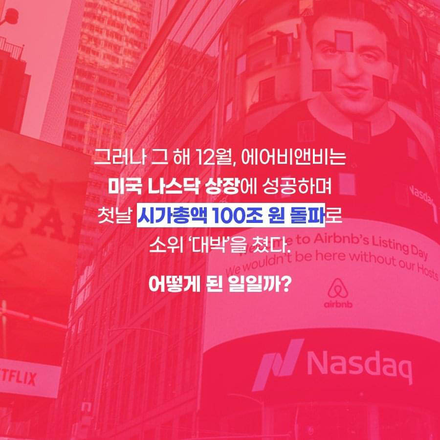 그러나 2020년 12월 에어비앤비는 나스닥에 상장을 해 시가총액 100조원 돌파를 하게 되었죠!