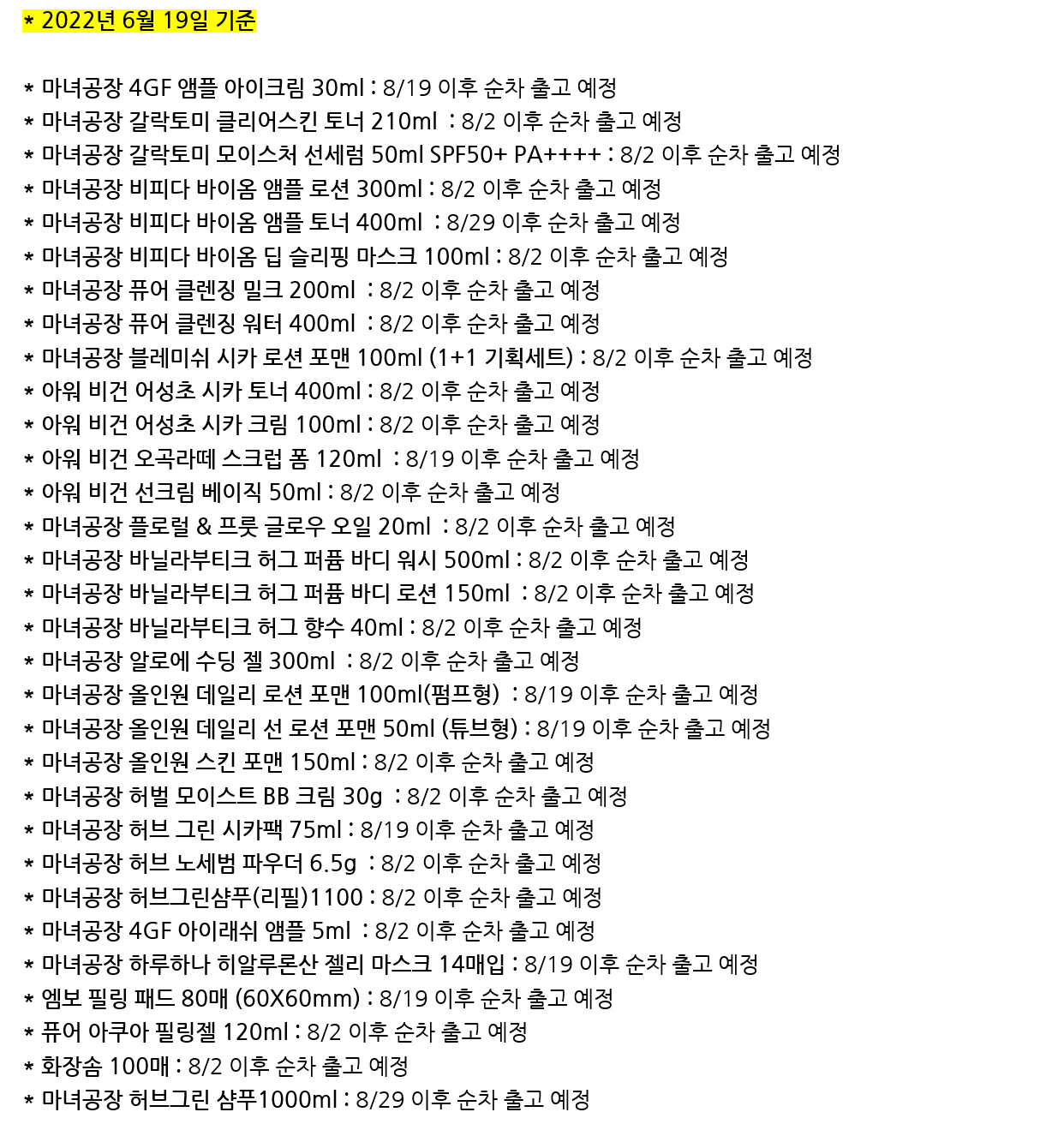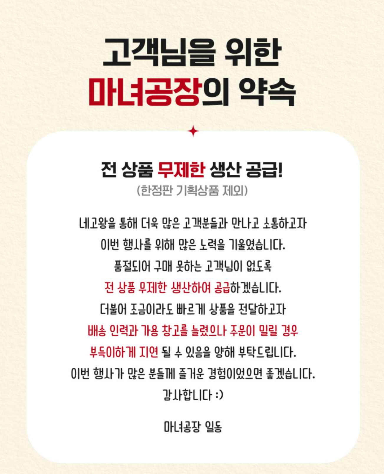 마녀공장에서는 품절이 되어도 무제한 생산을 해서 공급을 한다고 약속을 했습니다.
