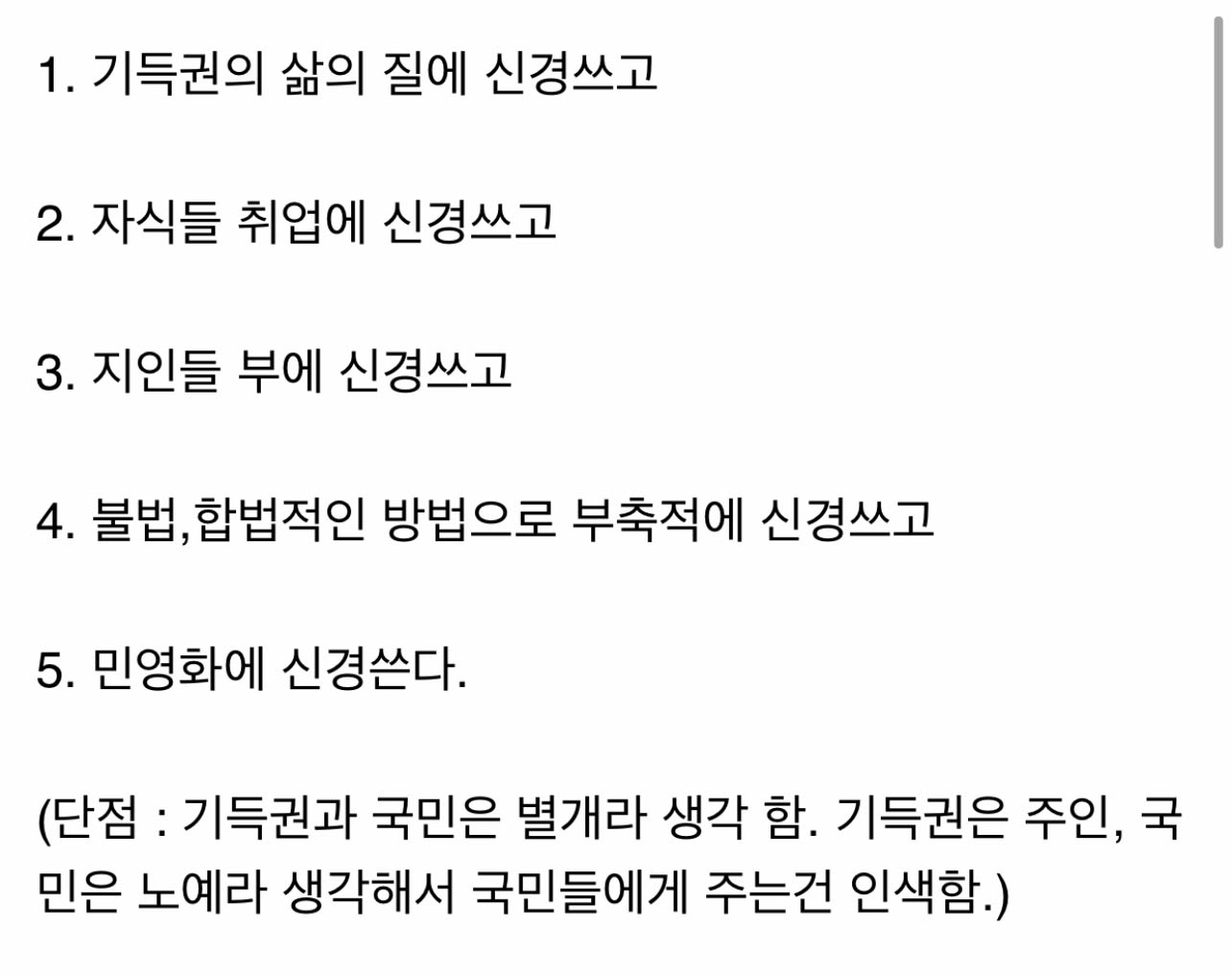 또 어떤당은 기득권의 삶의 질에 신경쓰고 자식들 취업에 신경쓰고 지인들 부에 신경쓰고 불법,합법적인 방법으로 부축적에 신경쓰고 민영화에 신경을 쓰죠.