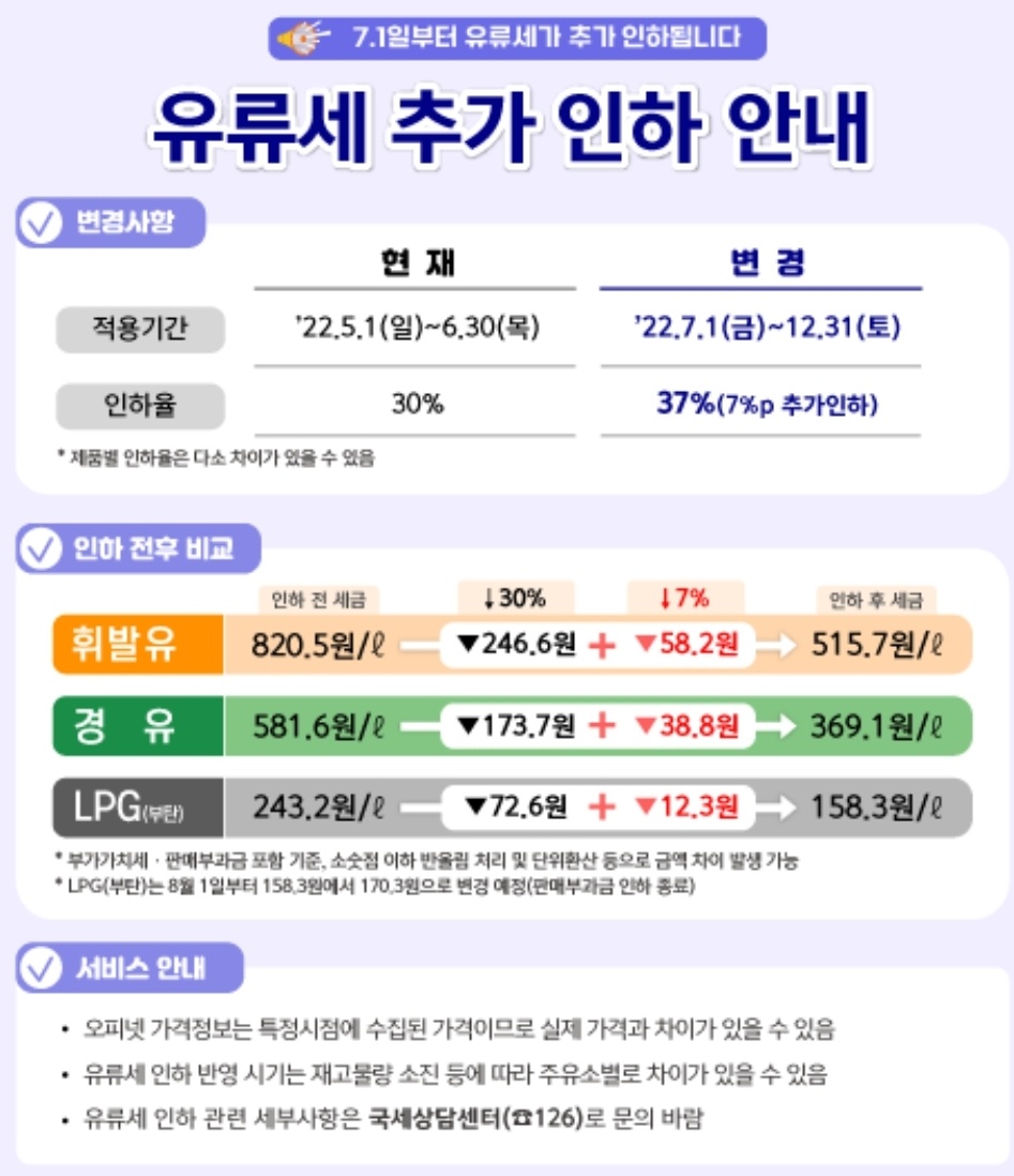 7월 1일부터 유류세 인하 폭이 30%에서 37%로 확대가 됩니다.