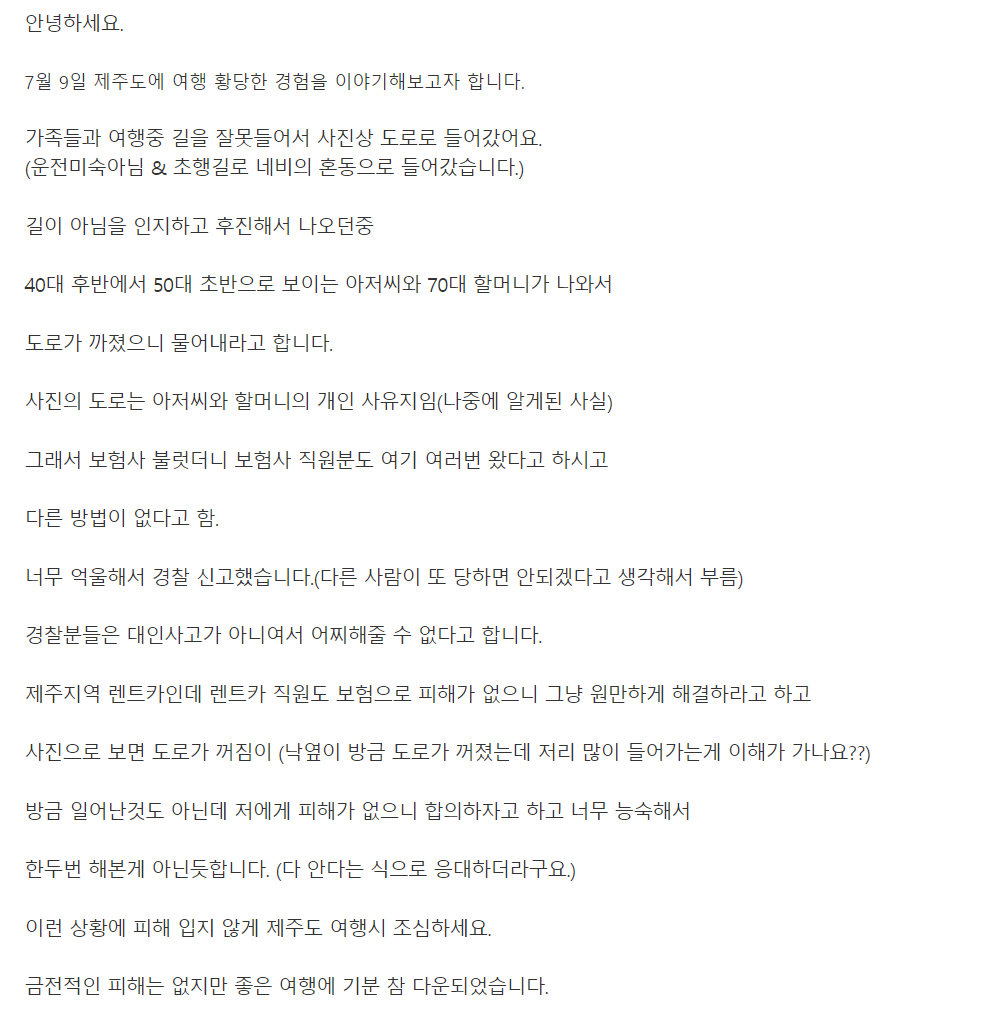 제주도 여행시 조심하라는 한 사연의 글이 있습니다.