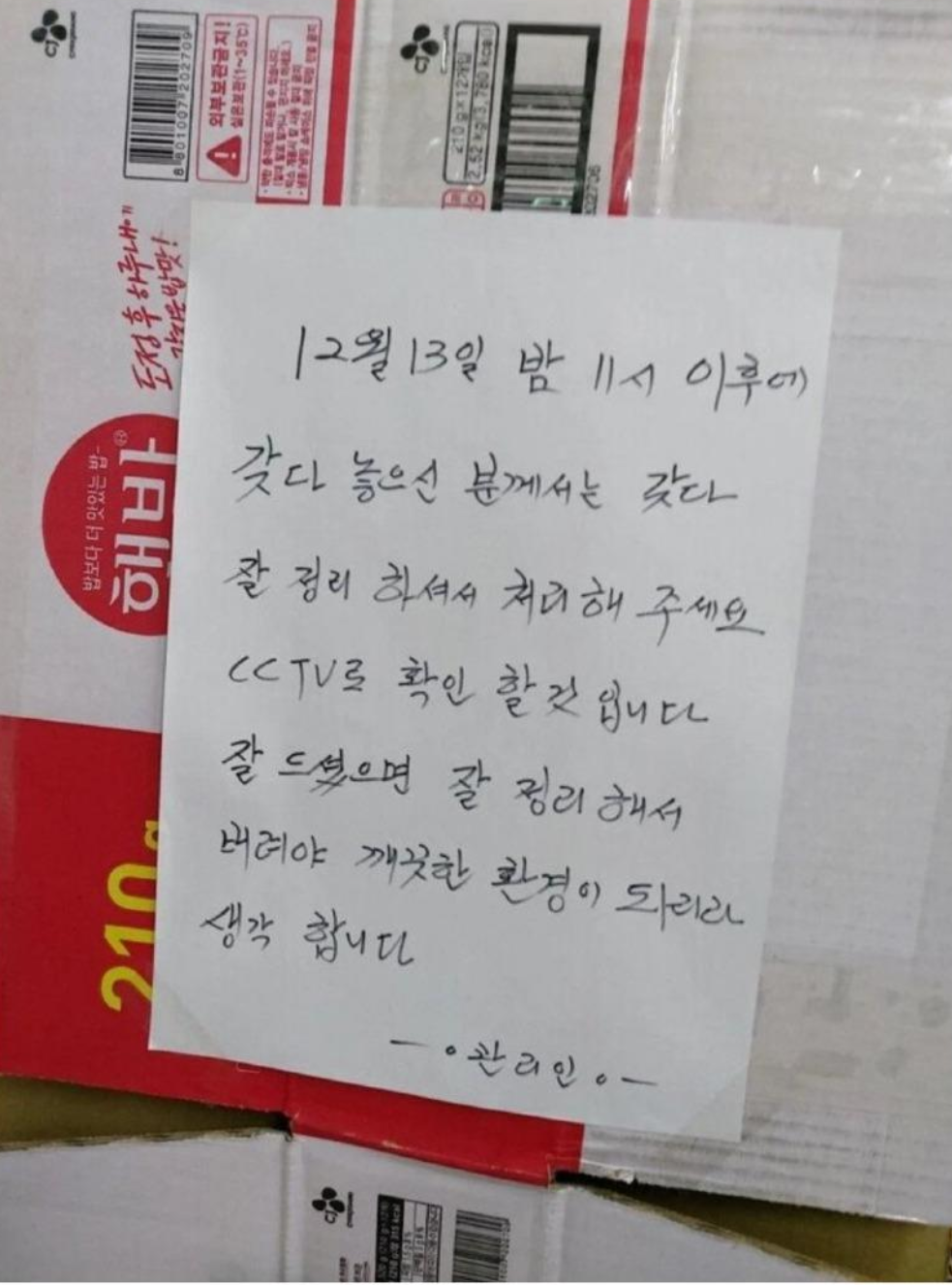 12월 13일 밤11시 이후 갖다 놓으신분은 다시 정리하라고...