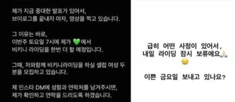 "제가 지금 중대한 발표가 있어서 브이로그를 끝내자마자 영상을 찍고 있다"고 하며 "이번 주 토요일 7시에 비키니 라이딩을 한 번 더 할 예정"이라며 "저와 함께하실 인플루언서 여성 두 분을 모집하고 있다"고 글을 남겼는데...