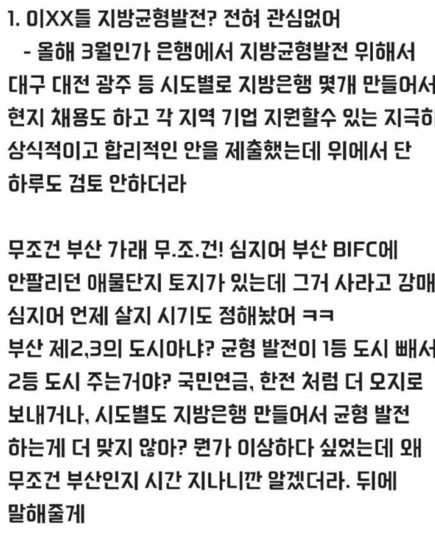1. 지방균형발전을 위해 시도별로 지방은행 몇개 만들어 채용등 기업지원안을 제출했지만 검토도 안함