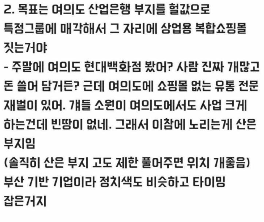 2. 여의도 산업은행 부지를 헐값으로 특정그룹에 매각을 해 쇼핑몰을 지을 예정