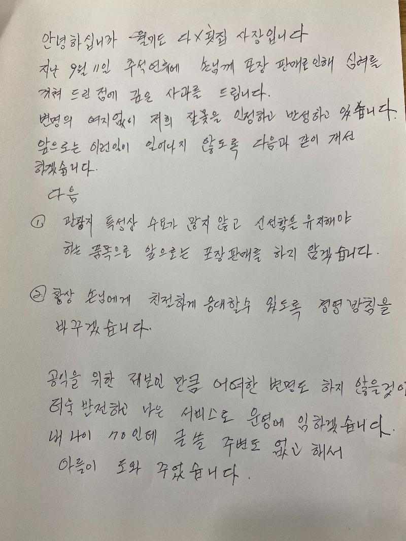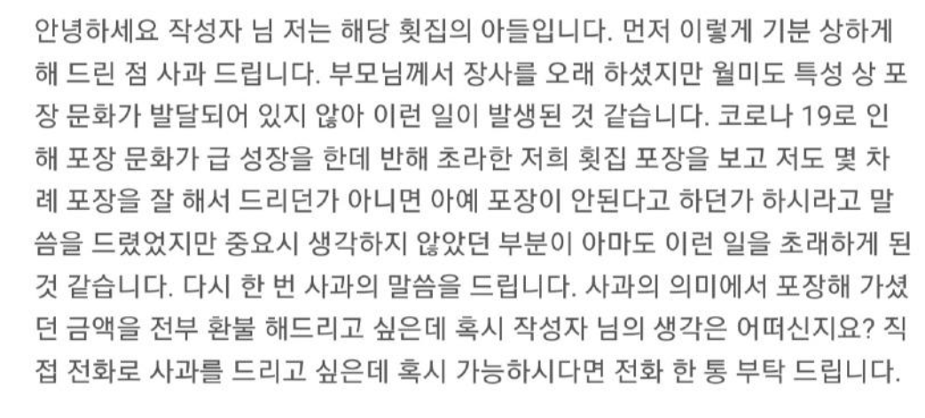 사과의 의미로 횟포장 금액 전액 환불 해드리고 싶고! 직접 전화로 사과를 하고 싶습니다.