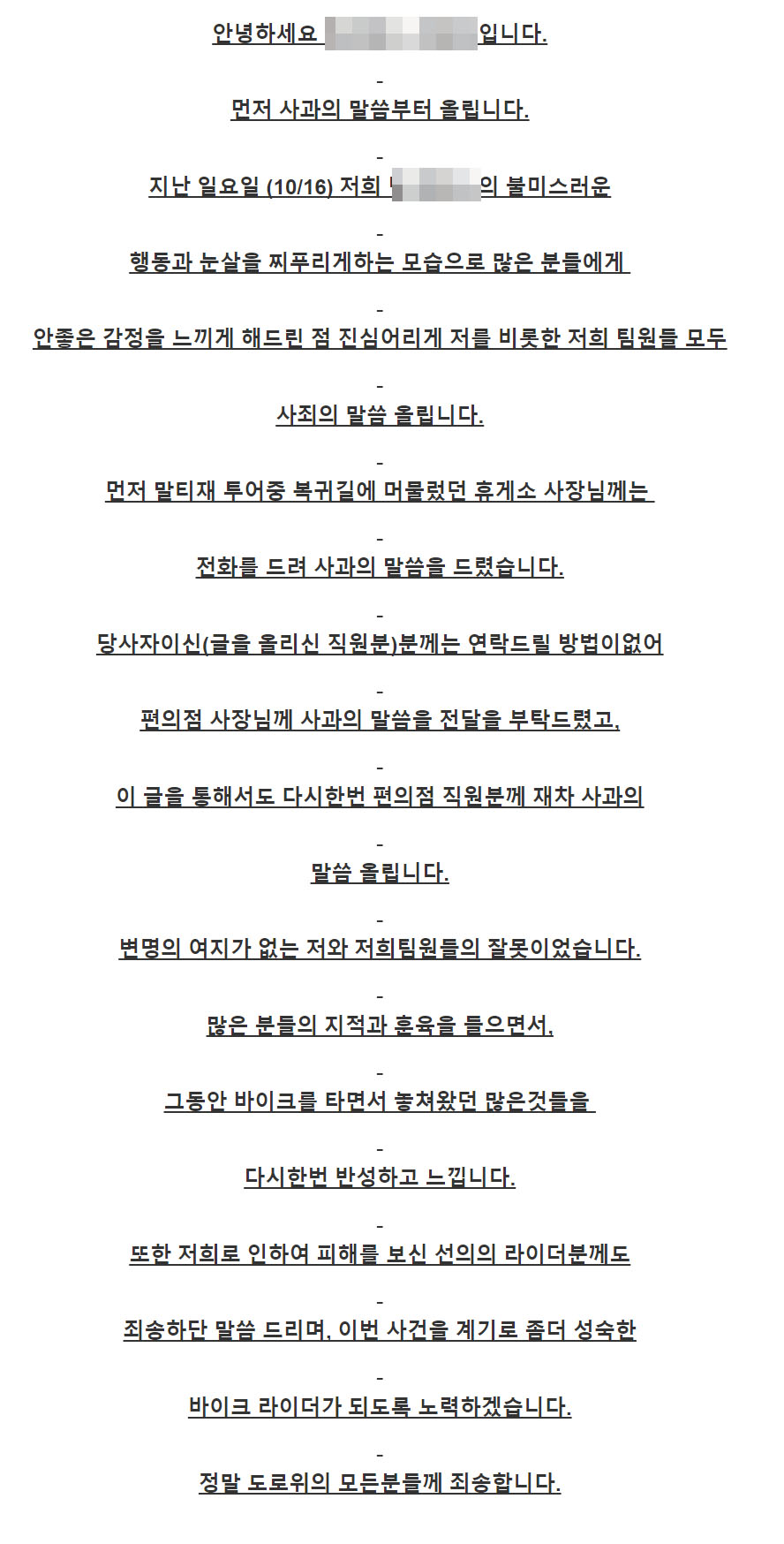 변명도 없고! 저는 차라리 이렇게 상남자의 오토바이 답게 상남자의 사과문이 훨씬 보기 좋았습니다.