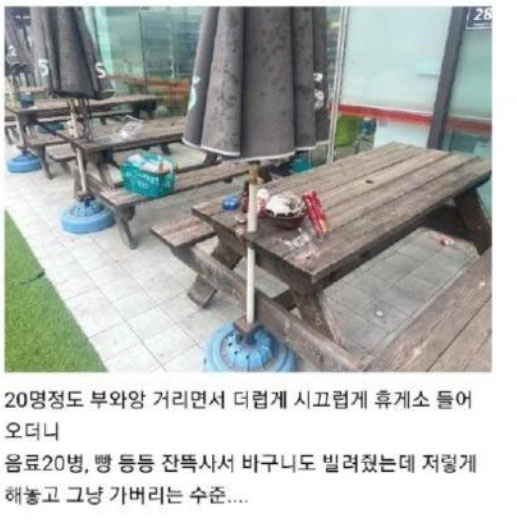 해당 글쓴이는 20명정도 휴게소에 들려 소음피해와 휴게소 음식과 음료들을 그냥 버리고 갔다고 글을 올렸습니다.